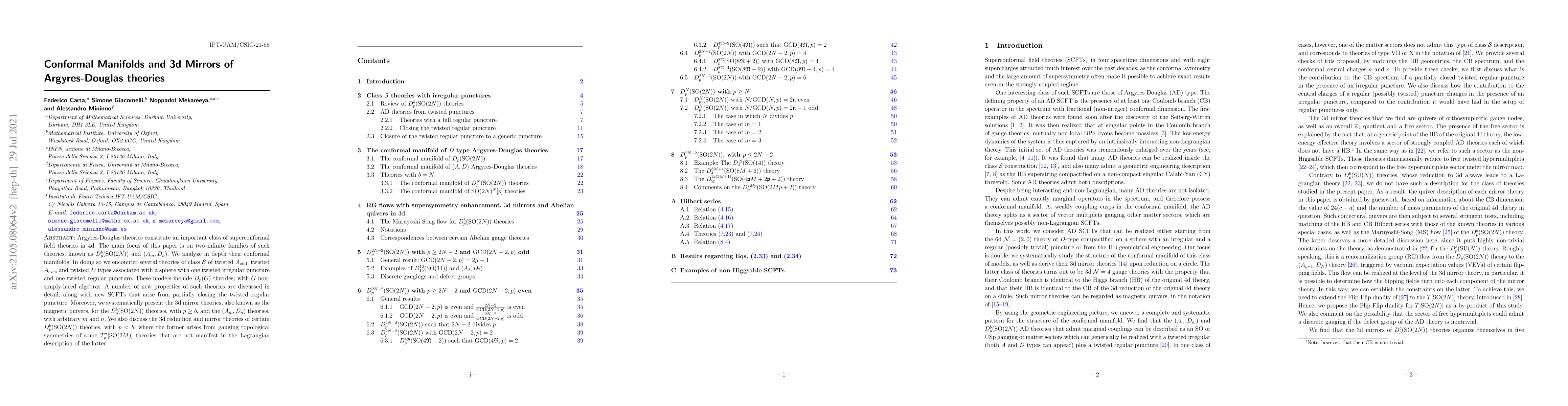 Argyres-Douglas theories constitute an important class of superconformal field theories in $4$d. The main focus of this paper is on two infinite families of such theories, known as $D^b_p(\mathrm{SO}(2N))$ and $(A_m, D_n)$. We analyze in depth their conformal manifolds. In doing so we encounter several theories of class $\mathcal{S}$ of twisted $A_{\text{odd}}$, twisted $A_{\text{even}}$ and twisted $D$ types associated with a sphere with one twisted irregular puncture and one twisted regular puncture. These models include $D_p(G)$ theories, with $G$ non-simply-laced algebras. A number of new properties of such theories are discussed in detail, along with new SCFTs that arise from partially closing the twisted regular puncture. Moreover, we systematically present the $3$d mirror theories, also known as the magnetic quivers, for the $D^b_p(\mathrm{SO}(2N))$ theories, with $p \geq b$, and the $(A_m, D_n)$ theories, with arbitrary $m$ and $n$. We also discuss the $3$d reduction and mirror theories of certain $D^b_p(\mathrm{SO}(2N))$ theories, with $p < b$, where the former arises from gauging topological symmetries of some $T^\sigma_\rho[\mathrm{SO}(2M)]$ theories that are not manifest in the Lagrangian description of the latter.