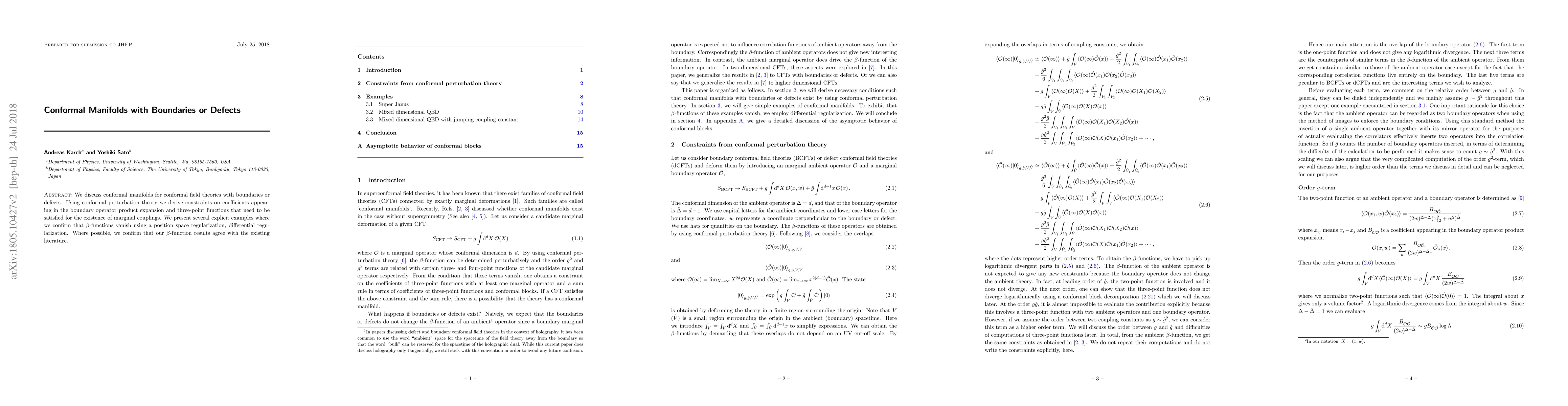 This paper explores conformal manifolds in the context of conformal field theories with boundaries or defects, deriving constraints on boundary operator product expansions and three-point functions for marginal couplings. It confirms vanishing $\beta$-functions in several examples using position and differential regularization, aligning with existing literature where possible.