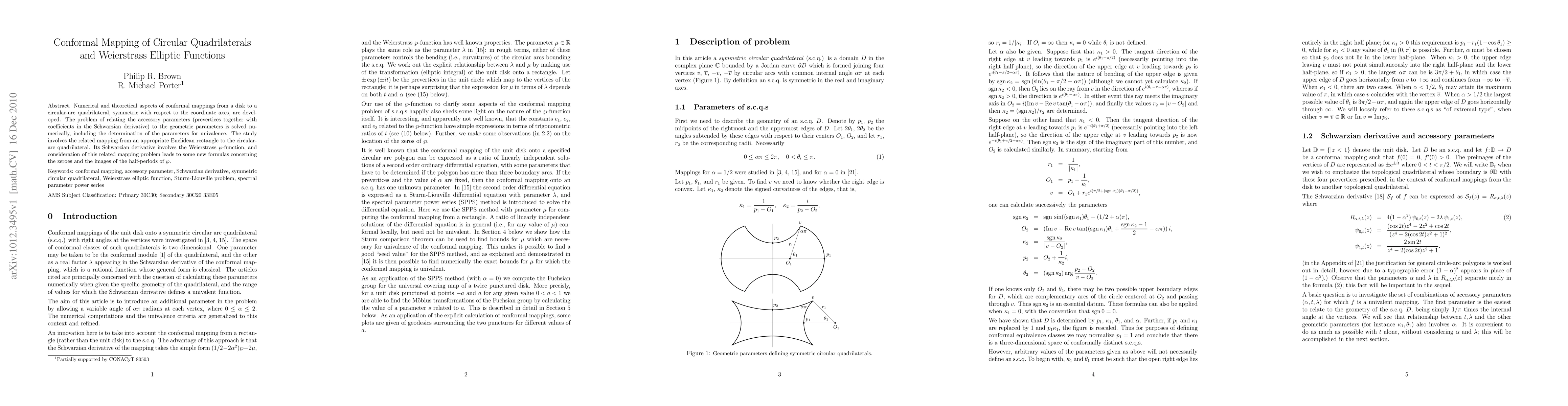 This paper develops numerical and theoretical methods for conformal mappings from a disk to a circular-arc quadrilateral, focusing on the relationship between accessory parameters and geometric parameters. It introduces new formulas involving the Weierstrass P-function and the Schwarzian derivative, particularly in the context of mapping a Euclidean rectangle to the quadrilateral.