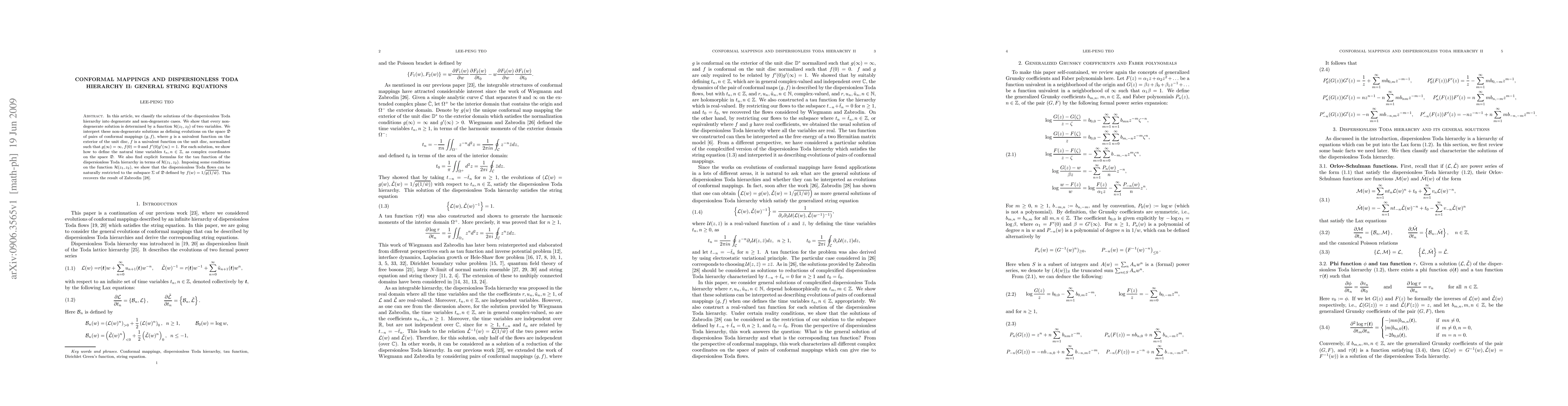 In this article, we classify the solutions of the dispersionless Toda hierarchy into degenerate and non-degenerate cases. We show that every non-degenerate solution is determined by a function $\mathcal{H}(z_1,z_2)$ of two variables. We interpret these non-degenerate solutions as defining evolutions on the space $\mathfrak{D}$ of pairs of conformal mappings $(g,f)$, where $g$ is a univalent function on the exterior of the unit disc, $f$ is a univalent function on the unit disc, normalized such that $g(\infty)=\infty$, $f(0)=0$ and $f'(0)g'(\infty)=1$. For each solution, we show how to define the natural time variables $t_n, n\in\Z$, as complex coordinates on the space $\mathfrak{D}$. We also find explicit formulas for the tau function of the dispersionless Toda hierarchy in terms of $\mathcal{H}(z_1, z_2)$. Imposing some conditions on the function $\mathcal{H}(z_1, z_2)$, we show that the dispersionless Toda flows can be naturally restricted to the subspace $\Sigma$ of $\mathfrak{D}$ defined by $f(w)=1/\overline{g(1/\bar{w})}$. This recovers the result of Zabrodin.