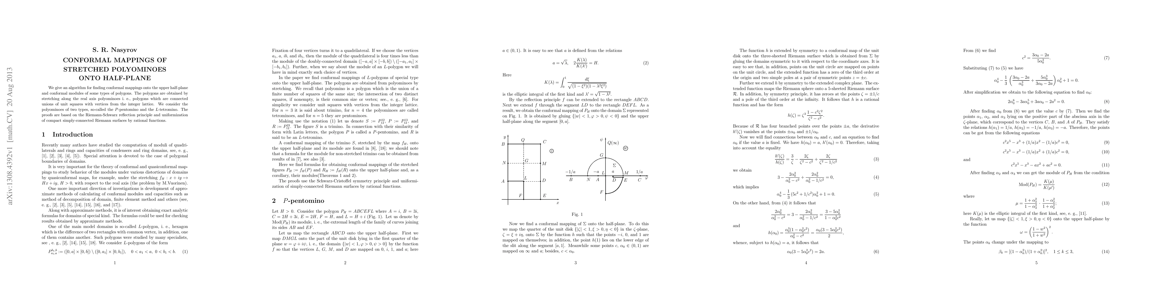 This paper presents an algorithm for determining conformal mappings and modules of stretched polyominoes onto the upper half-plane, focusing on $P$-pentominoes and $L$-tetrominoes. The proofs leverage the Riemann-Schwarz reflection principle and rational function uniformization.