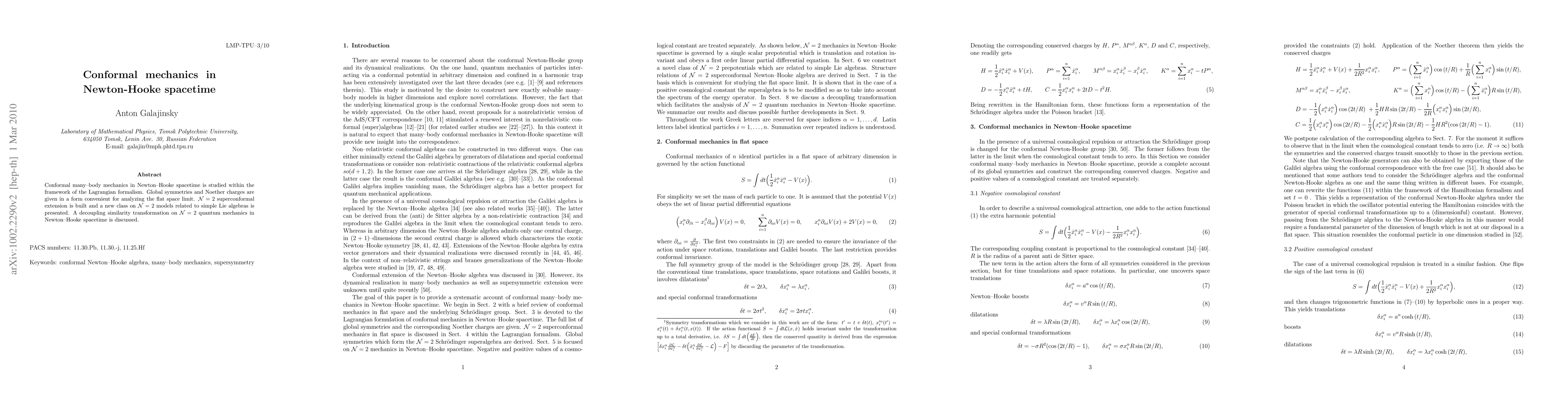 The research systematically studies conformal many-body mechanics in Newton-Hooke spacetime, deriving constraints on interaction potentials from conformal Newton-Hooke symmetry, presenting the Lagrangian, global symmetries, and conserved charges, and extending to N=2 superconformal mechanics.