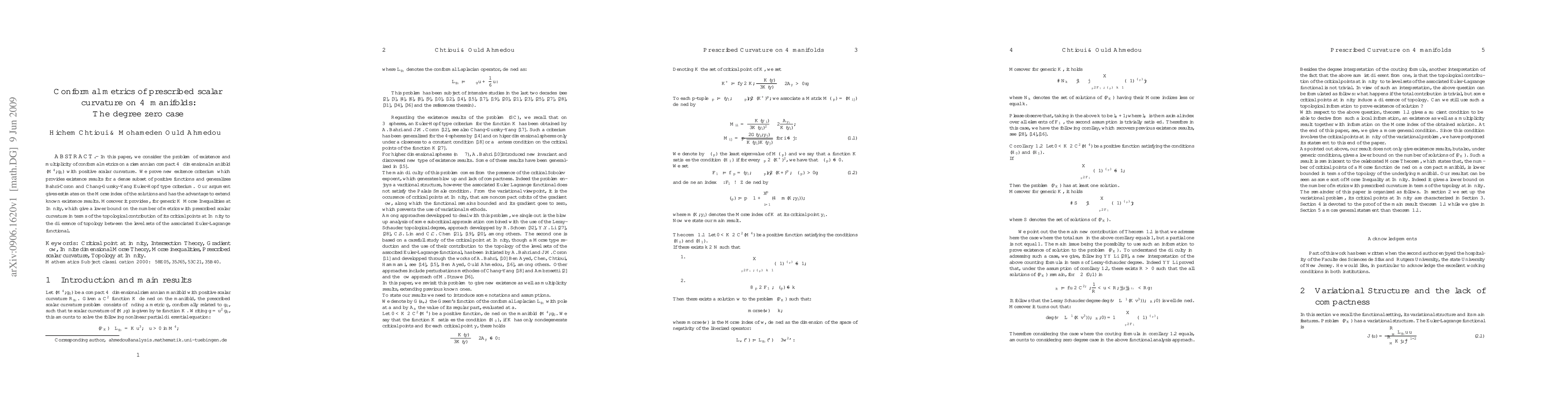 In this paper, we consider the problem of existence and multiplicity of conformal metrics on a riemannian compact $4-$dimensional manifold $(M^4,g_0)$ with positive scalar curvature. We prove new exitence criterium which provides existence results for a dense subset of positive functions and generalizes Bahri-Coron and Chang-Gursky-Yang Euler-Hopf type criterium. Our argument gives estimates on the Morse index of the solutions and has the advantage to extend known existence results. Moreover it provides, for generic $K$ {\it Morse Inequalities at Infinity}, which give a lower bound on the number of metrics with prescribed scalar curvature in terms of the topological contribution of its "critical points at Infinity" to the difference of topology between the level sets of the associated Euler-Lagrange functional.