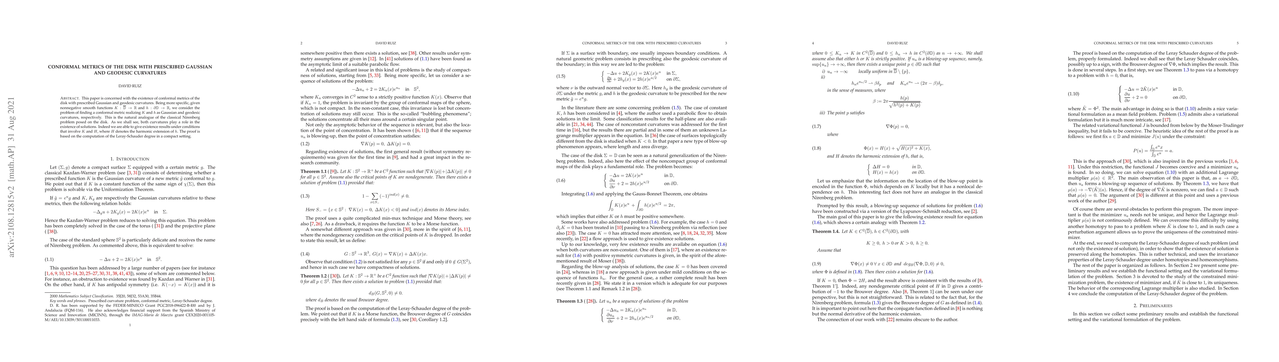 This paper investigates the existence of conformal metrics on the disk with prescribed Gaussian and geodesic curvatures, providing existence results under conditions involving both curvatures and the harmonic extension of the boundary curvature. The proof leverages the Leray-Schauder degree in a compact setting.