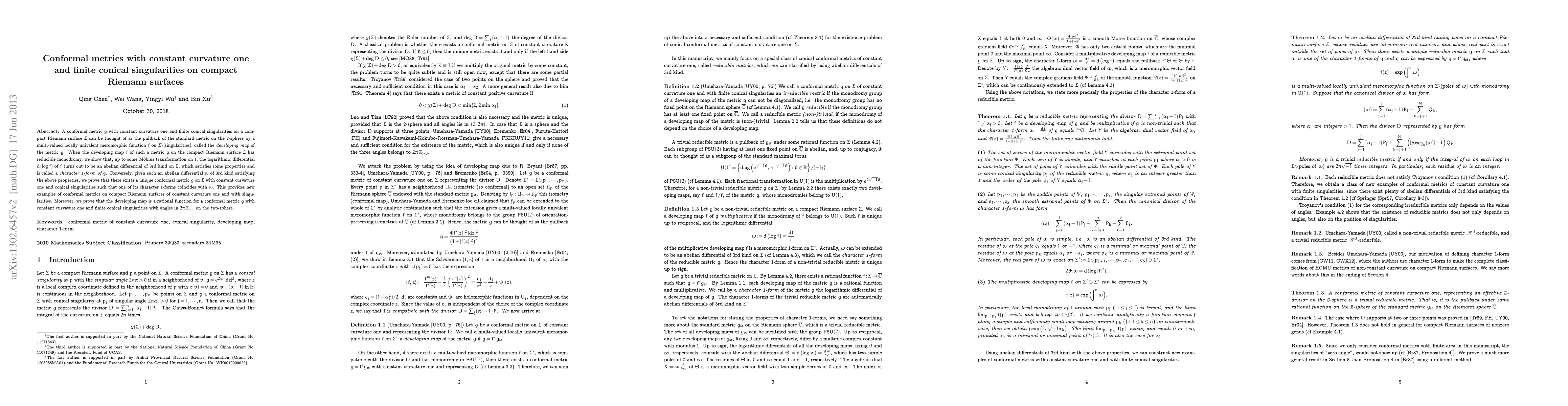 This paper explores conformal metrics on compact Riemann surfaces with constant curvature one and finite conical singularities, showing that their developing maps, when reducible, yield unique character 1-forms—abelian differentials of the third kind. It establishes a correspondence between these forms and the metrics, and proves that the developing map is a rational function for metrics with specific singularity angles.