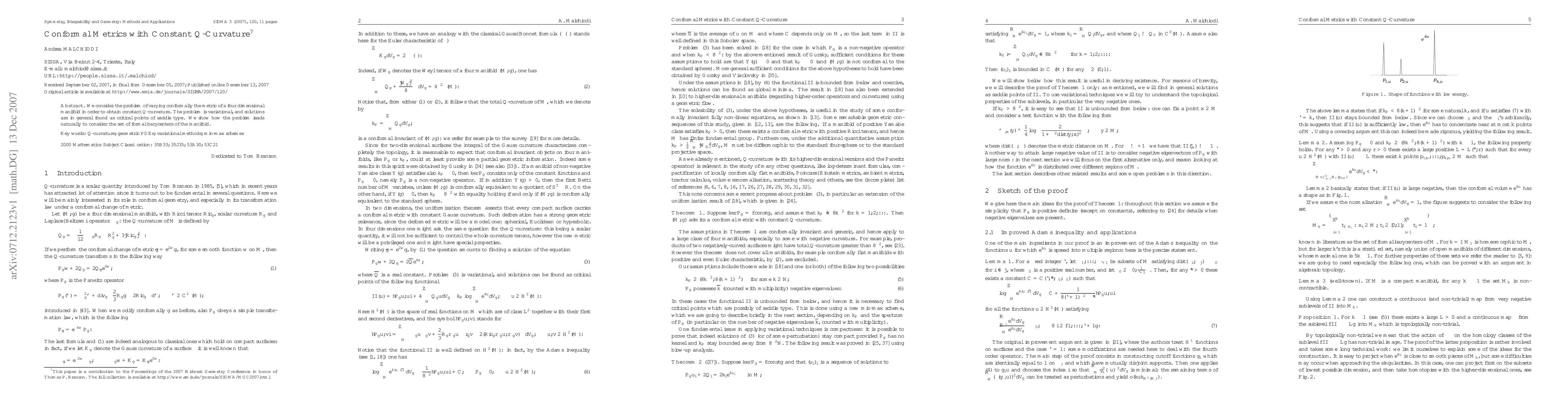 We consider the problem of varying conformally the metric of a four dimensional manifold in order to obtain constant $Q$-curvature. The problem is variational, and solutions are in general found as critical points of saddle type. We show how the problem leads naturally to consider the set of formal barycenters of the manifold.