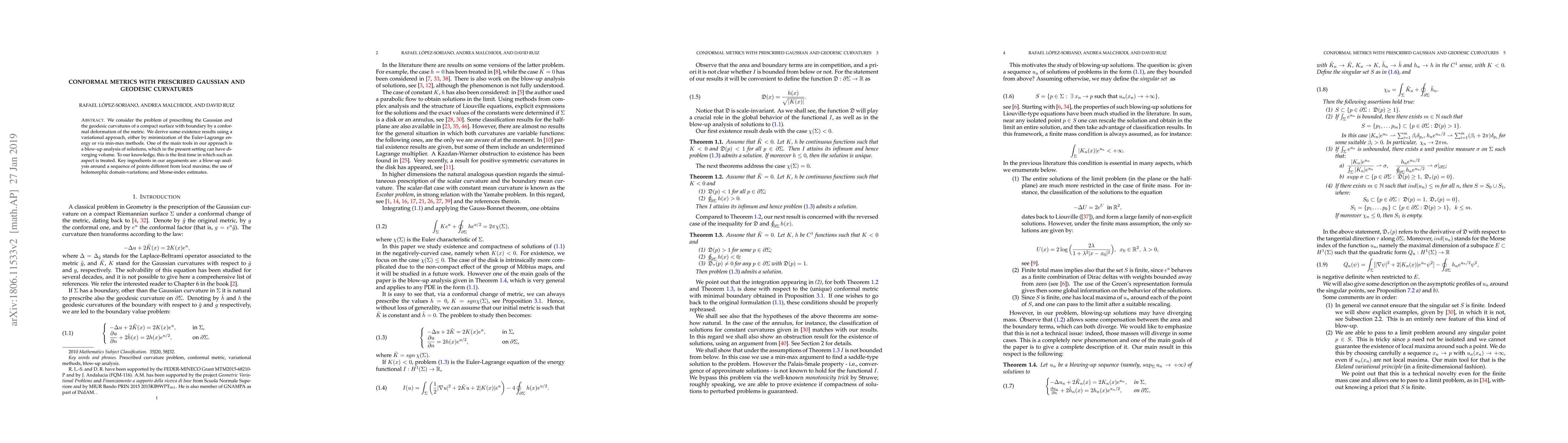 This paper explores conformal deformations of metrics to prescribe Gaussian and geodesic curvatures on compact surfaces with boundaries, employing variational methods and a novel blow-up analysis to handle solutions with diverging volume. Key techniques include analyzing points away from local maxima, holomorphic domain-variations, and Morse-index estimates.