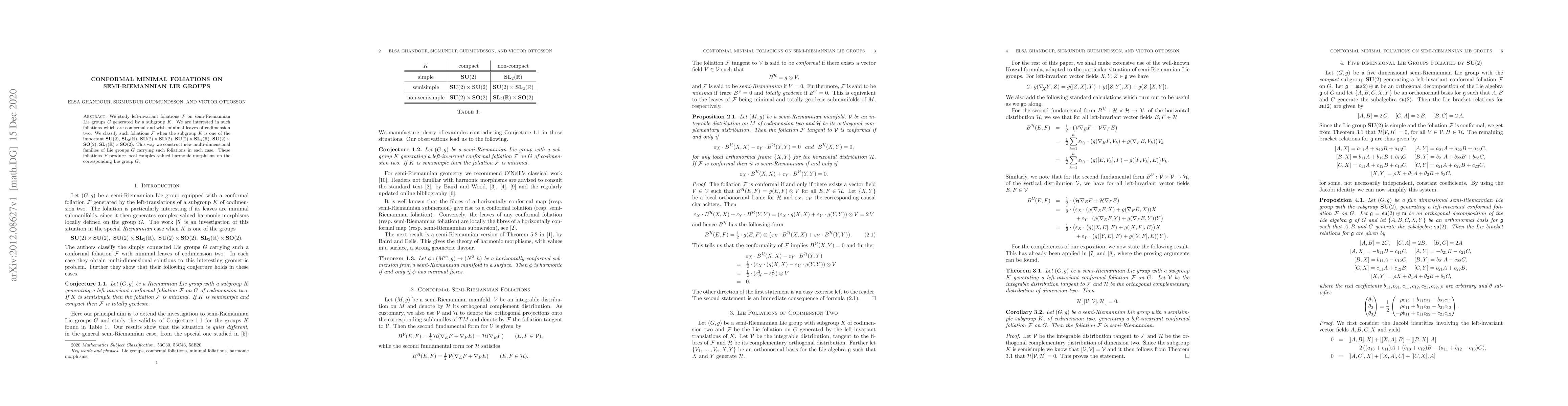 We study left-invariant foliations ${\mathcal F}$ on semi-Riemannian Lie groups $G$ generated by a subgroup $K$. We are interested in such foliations which are conformal and with minimal leaves of codimension two. We classify such foliations ${\mathcal F}$ when the subgroup $K$ is one of the important $\text{SU}(2)$, $\text{SL}_{2}(\mathbb R)$, $\text{SU}(2)\times\text{SU}(2)$, $\text{SU}(2)\times\text{SL}_{2}(\mathbb R)$, $\text{SU}(2)\times\text{SO}(2)$, $\text{SL}_{2}(\mathbb R)\times\text{SU}(2)$. This way we construct new multi-dimensional families of Lie groups $G$ carrying such foliations in each case. These foliations ${\mathcal F}$ produce local complex-valued harmonic morphisms on the corresponding Lie group $G$.