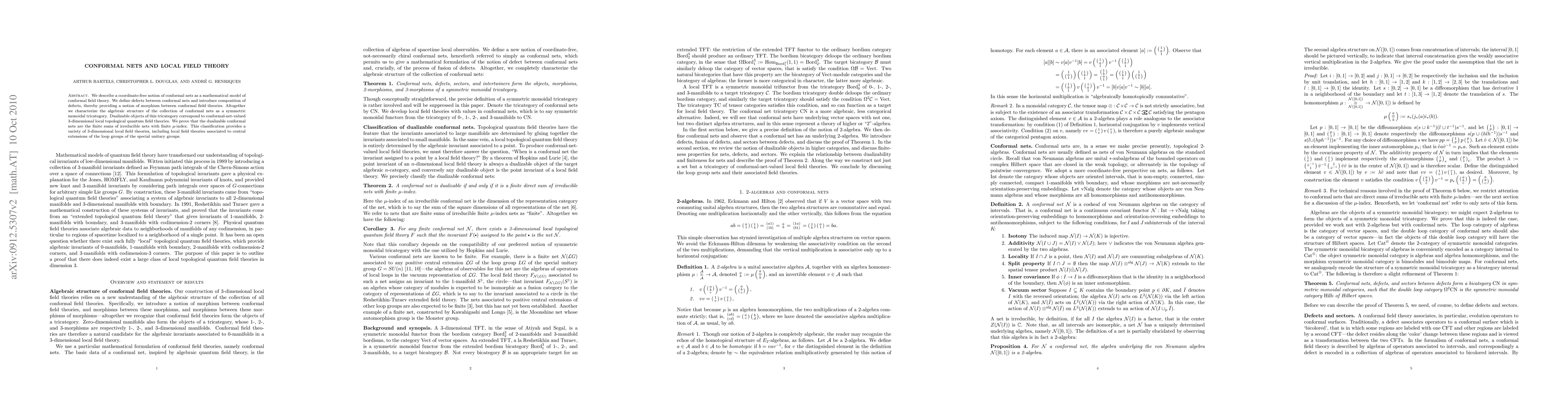 This paper introduces conformal nets as a coordinate-free model for conformal field theory, defining defects and their composition to form a symmetric monoidal tricategory. It classifies dualizable conformal nets as finite sums of irreducible nets with finite μ-index, linking them to 3-dimensional local topological quantum field theories.