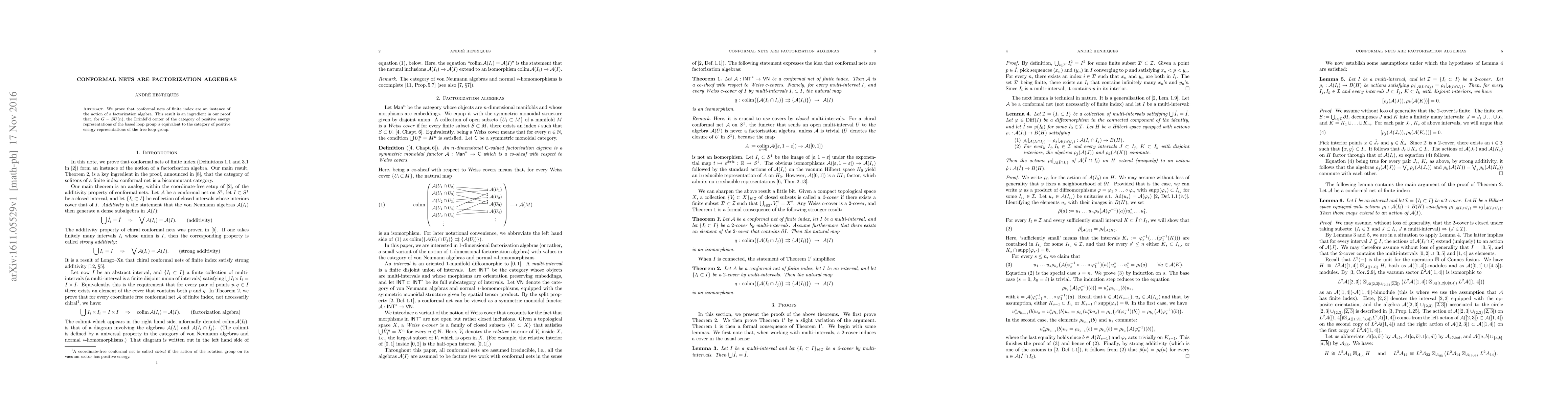 This paper demonstrates that conformal nets of finite index can be viewed as factorization algebras, a key step towards proving the equivalence between the Drinfel'd center of $SU(n)$'s positive energy representations and those of the free loop group.