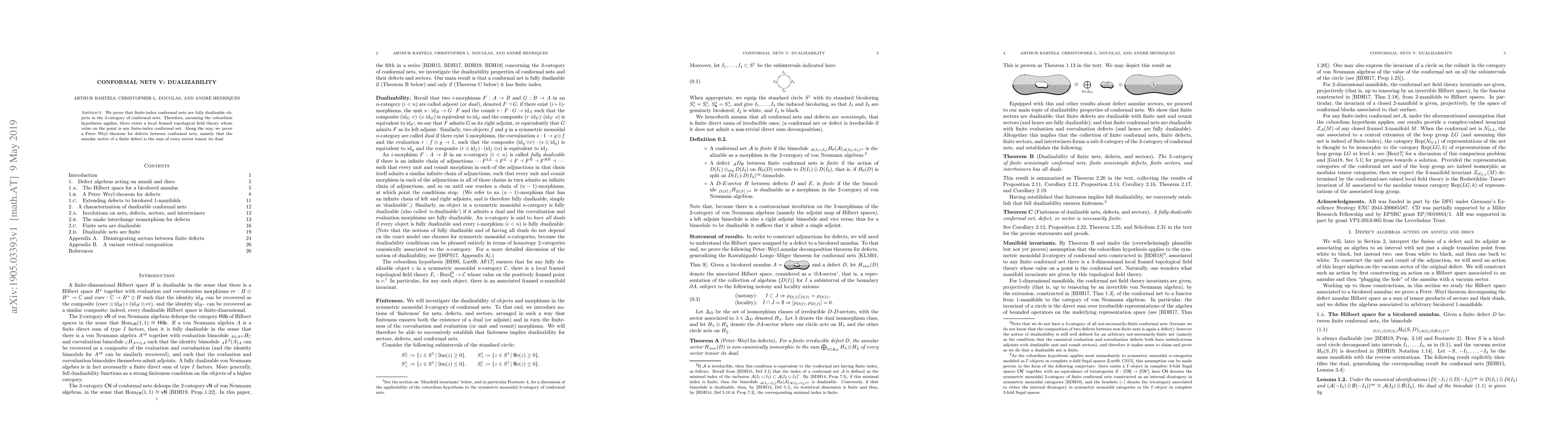 This paper demonstrates that finite-index conformal nets are fully dualizable in the 3-category of conformal nets and proves a Peter-Weyl theorem for defects, establishing the annular sector sum for finite defects.