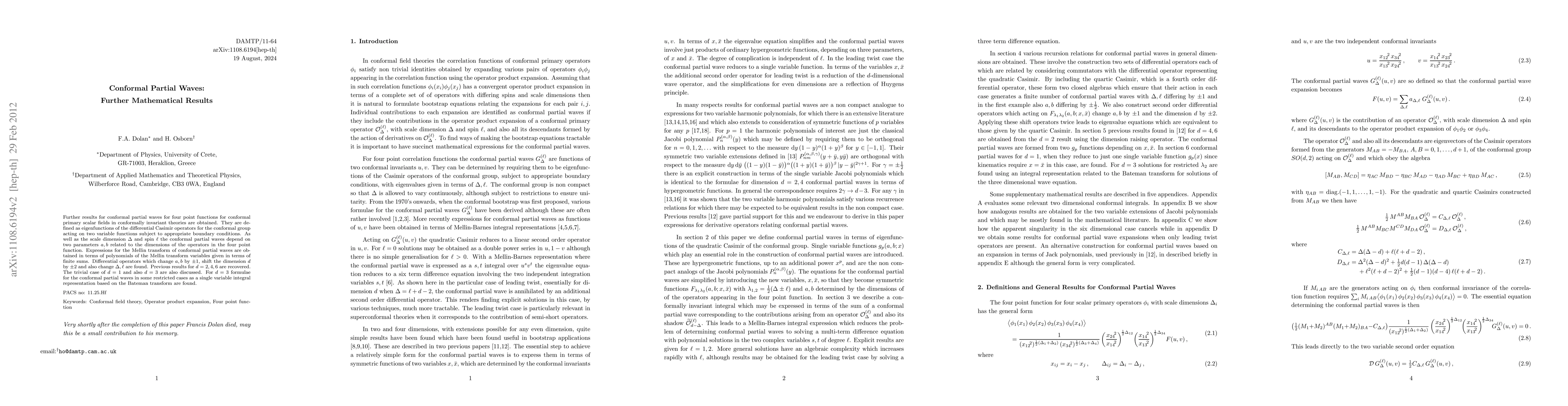 Further results for conformal partial waves for four point functions for conformal primary scalar fields in conformally invariant theories are obtained. They are defined as eigenfunctions of the differential Casimir operators for the conformal group acting on two variable functions subject to appropriate boundary conditions. As well as the scale dimension $\Delta$ and spin $\ell$ the conformal partial waves depend on two parameters $a,b$ related to the dimensions of the operators in the four point function. Expressions for the Mellin transform of conformal partial waves are obtained in terms of polynomials of the Mellin transform variables given in terms of finite sums. Differential operators which change $a,b$ by $\pm 1$, shift the dimension $d$ by $\pm 2$ and also change $\Delta,\ell$ are found. Previous results for $d=2,4,6$ are recovered. The trivial case of $d=1$ and also $d=3$ are also discussed. For $d=3$ formulae for the conformal partial waves in some restricted cases as a single variable integral representation based on the Bateman transform are found.