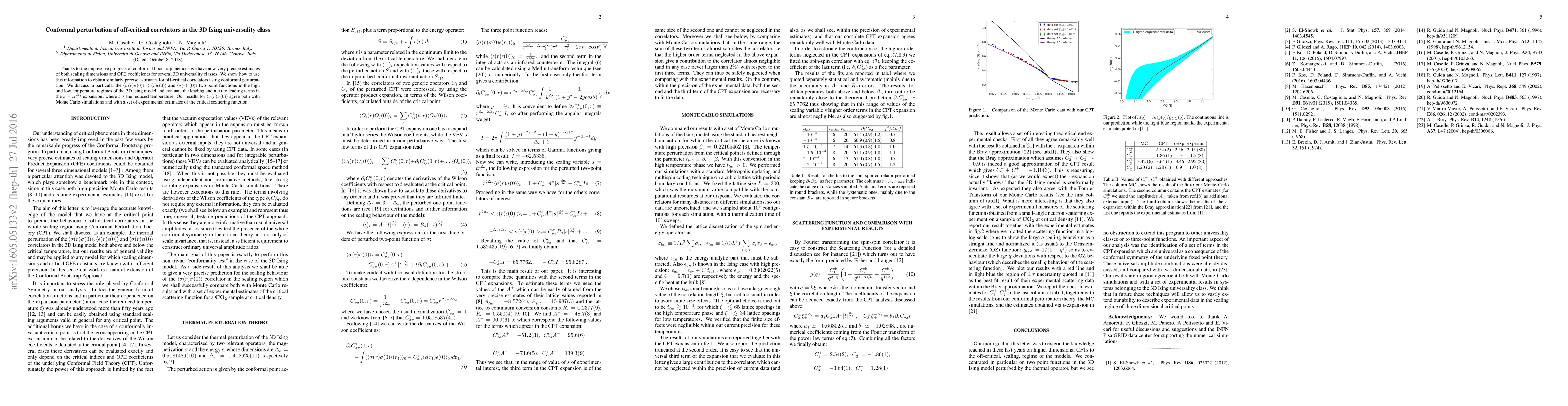 Thanks to the impressive progress of conformal bootstrap methods we have now very precise estimates of both scaling dimensions and OPE coefficients for several 3D universality classes. We show how to use this information to obtain similarly precise estimates for off-critical correlators using conformal perturbation. We discuss in particular the $< \sigma (r) \sigma (0) >$, $< \epsilon (r) \epsilon (0) >$ and $< \sigma (r) \epsilon (0) >$ two point functions in the high and low temperature regimes of the 3D Ising model and evaluate the leading and next to leading terms in the $s = t r^{\Delta_{t}}$ expansion, where $t$ is the reduced temperature. Our results for $< \sigma (r) \sigma (0) >$ agree both with Monte Carlo simulations and with a set of experimental estimates of the critical scattering function.