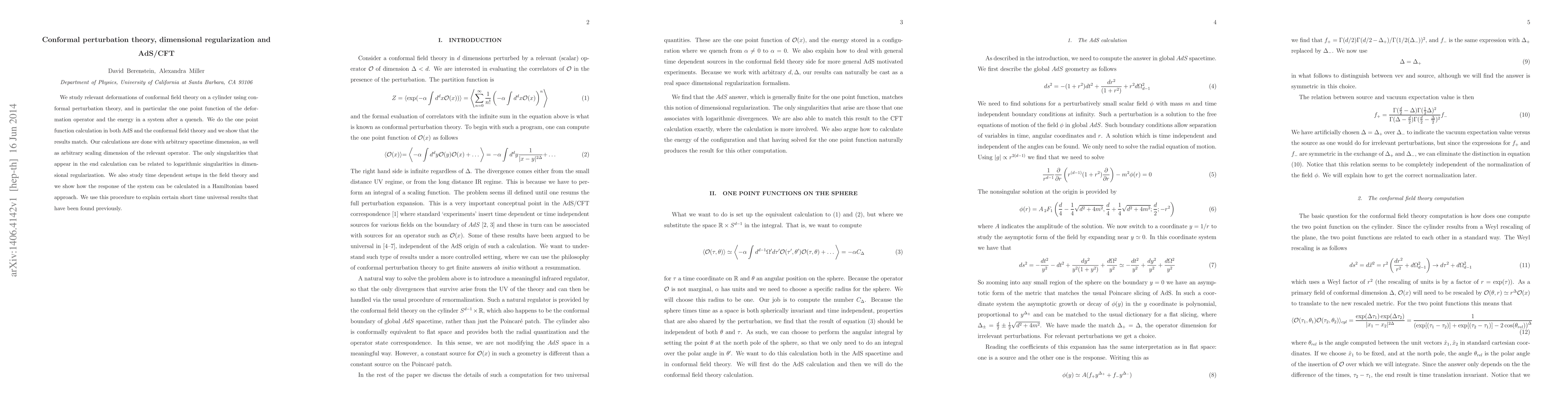 This research paper explores conformal perturbation theory and dimensional regularization in AdS/CFT, showing that results match across different spacetime dimensions and scaling dimensions, with implications for understanding universal short-time behavior in field theories.