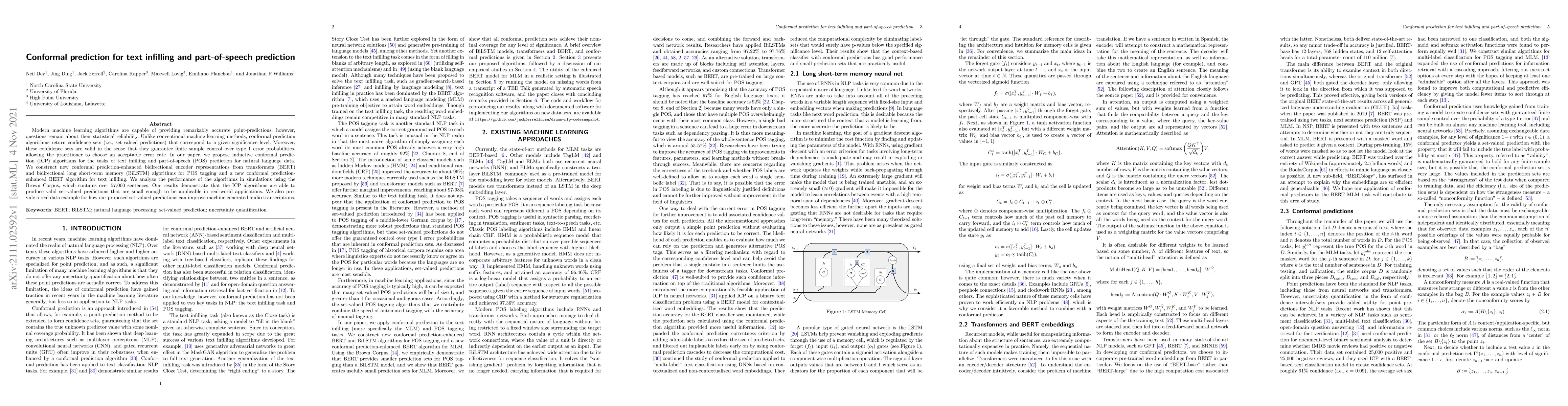 Modern machine learning algorithms are capable of providing remarkably accurate point-predictions; however, questions remain about their statistical reliability. Unlike conventional machine learning methods, conformal prediction algorithms return confidence sets (i.e., set-valued predictions) that correspond to a given significance level. Moreover, these confidence sets are valid in the sense that they guarantee finite sample control over type 1 error probabilities, allowing the practitioner to choose an acceptable error rate. In our paper, we propose inductive conformal prediction (ICP) algorithms for the tasks of text infilling and part-of-speech (POS) prediction for natural language data. We construct new conformal prediction-enhanced bidirectional encoder representations from transformers (BERT) and bidirectional long short-term memory (BiLSTM) algorithms for POS tagging and a new conformal prediction-enhanced BERT algorithm for text infilling. We analyze the performance of the algorithms in simulations using the Brown Corpus, which contains over 57,000 sentences. Our results demonstrate that the ICP algorithms are able to produce valid set-valued predictions that are small enough to be applicable in real-world applications. We also provide a real data example for how our proposed set-valued predictions can improve machine generated audio transcriptions.
