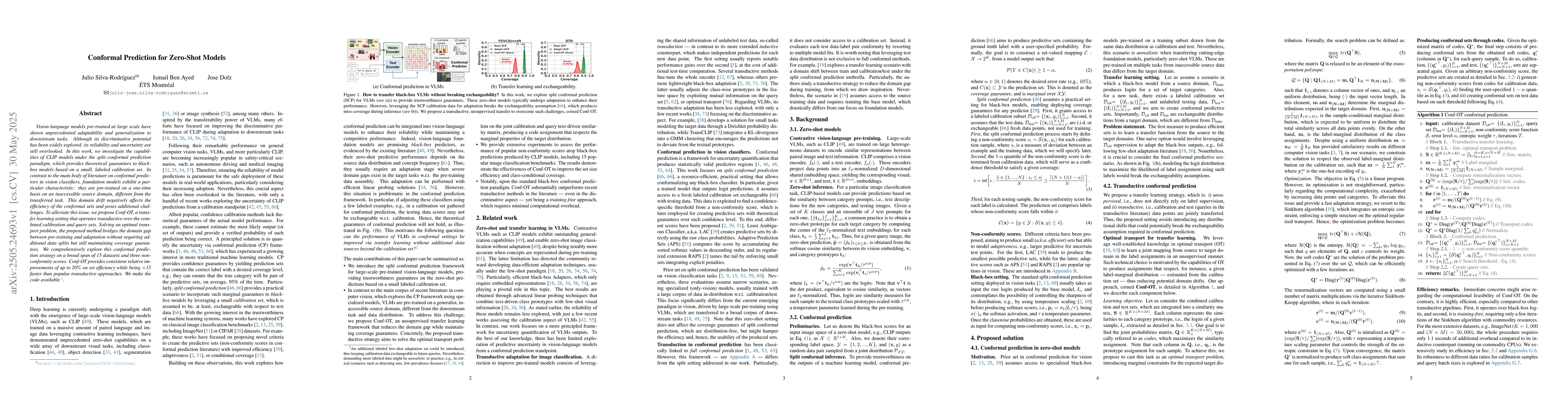 This research investigates the reliability and uncertainty of large-scale pre-trained vision-language models (foundation models) using the split conformal prediction paradigm, which provides theoretical guarantees for black-box models based on a small, labeled calibration set. The proposed Conf-OT method bridges the domain gap between pre-training and adaptation without additional data splits, maintaining coverage guarantees.