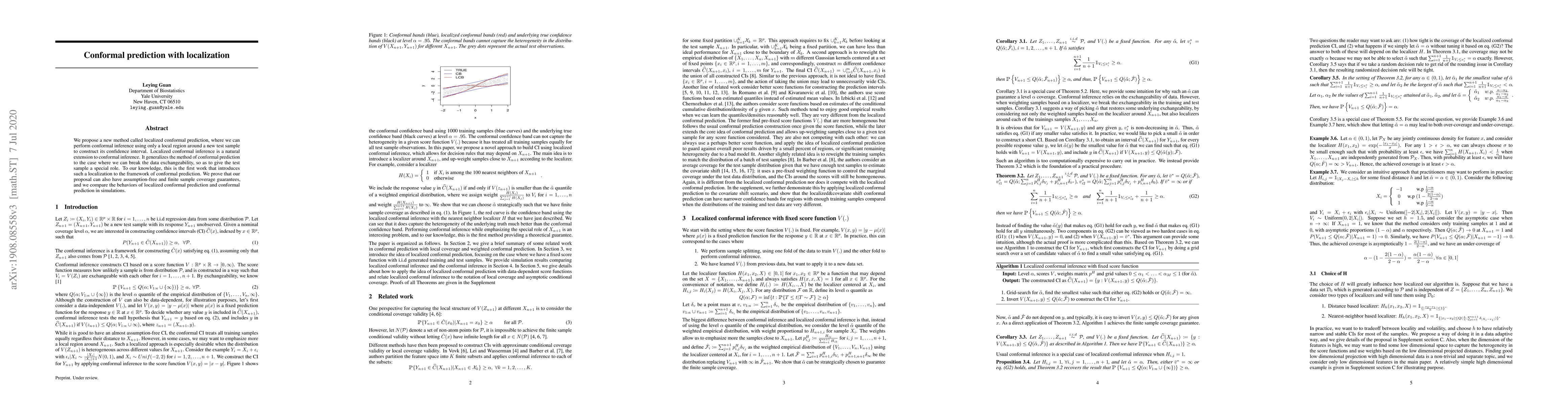 This paper proposes localized conformal prediction, a method that constructs confidence intervals for new test samples using only local data regions, breaking traditional exchangeability. The authors prove assumption-free finite sample coverage guarantees and compare it to standard conformal prediction through simulations.