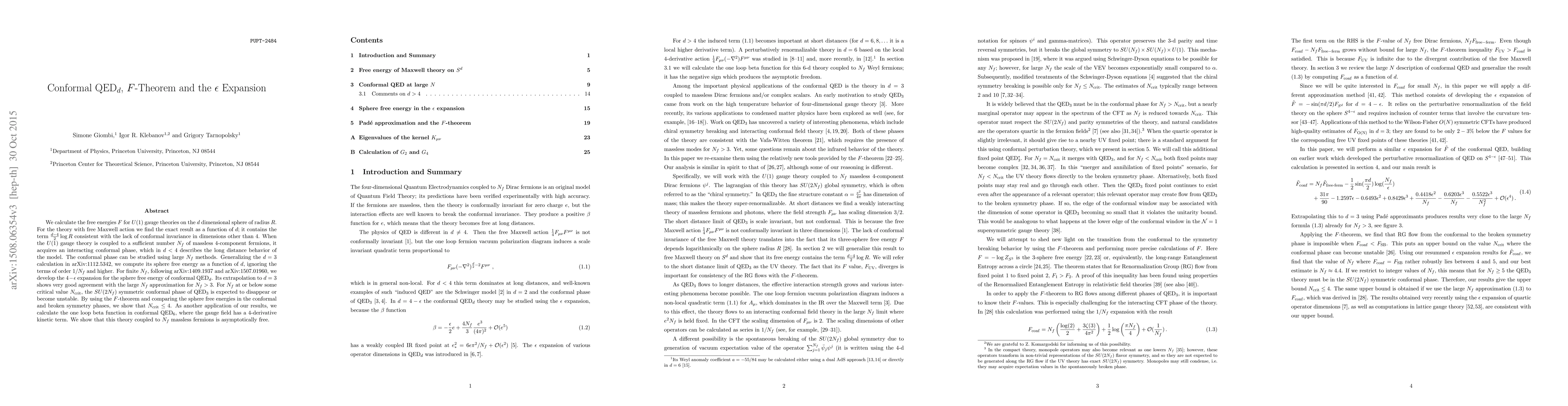 This paper calculates the free energies for $U(1)$ gauge theories on the $d$-dimensional sphere, finding a term $\frac{d-4}{2}\log R$ that reflects the lack of conformal invariance in dimensions other than 4. It explores the conformal phase of coupled gauge-fermion theories in $d<4$ and uses the $4-\epsilon$ expansion to study the sphere free energy, showing good agreement with large $N_f$ approximations.