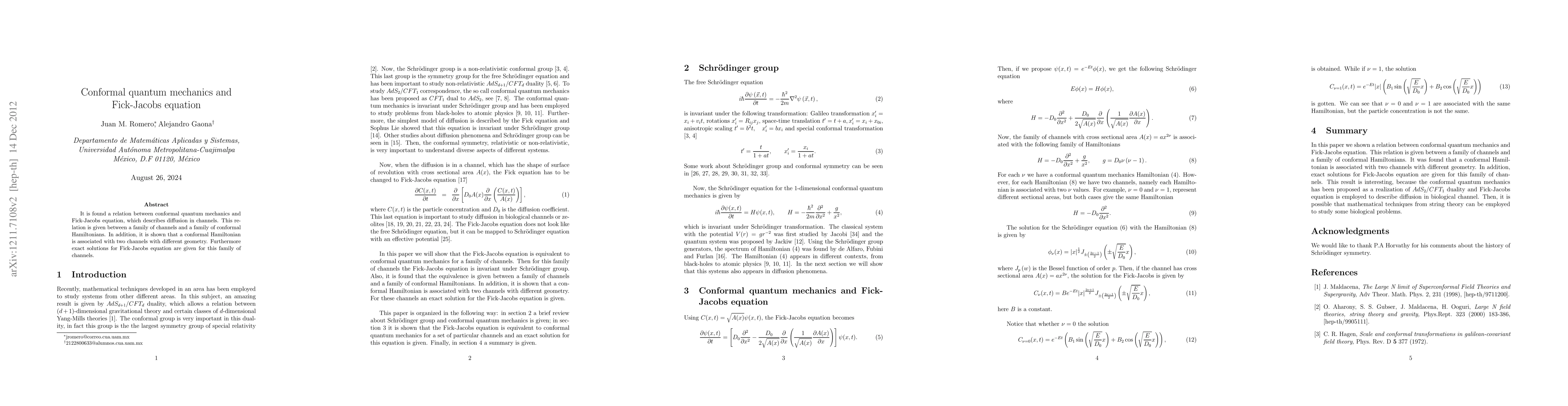 This paper establishes a connection between conformal quantum mechanics and the Fick-Jacobs equation, revealing a relationship between families of channels and conformal Hamiltonians. It also demonstrates that a single conformal Hamiltonian corresponds to two distinct channel geometries, and provides exact solutions for the Fick-Jacobs equation for these channels.