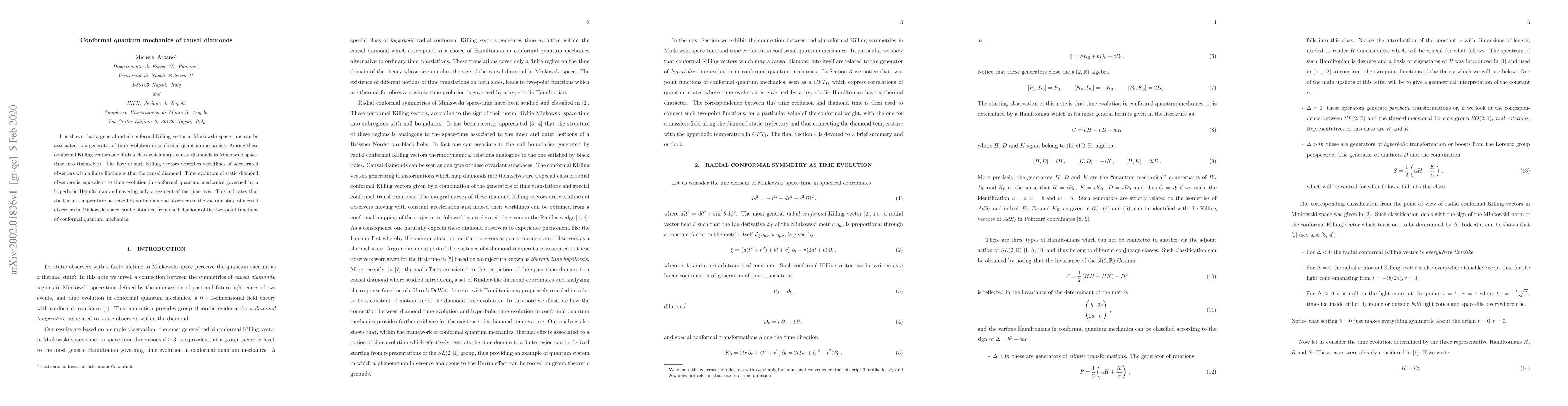 It is shown that a general radial conformal Killing vector in Minkowski space-time can be associated to a generator of time evolution in conformal quantum mechanics. Among these conformal Killing vectors one finds a class which maps causal diamonds in Minkowski space-time into themselves. The flow of such Killing vectors describes worldlines of accelerated observers with a finite lifetime within the causal diamond. Time evolution of static diamond observers is equivalent to time evolution in conformal quantum mechanics governed by a hyperbolic Hamiltonian and covering only a segment of the time axis. This indicates that the Unruh temperature perceived by static diamond observers in the vacuum state of inertial observers in Minkowski space can be obtained from the behaviour of the two-point functions of conformal quantum mechanics.