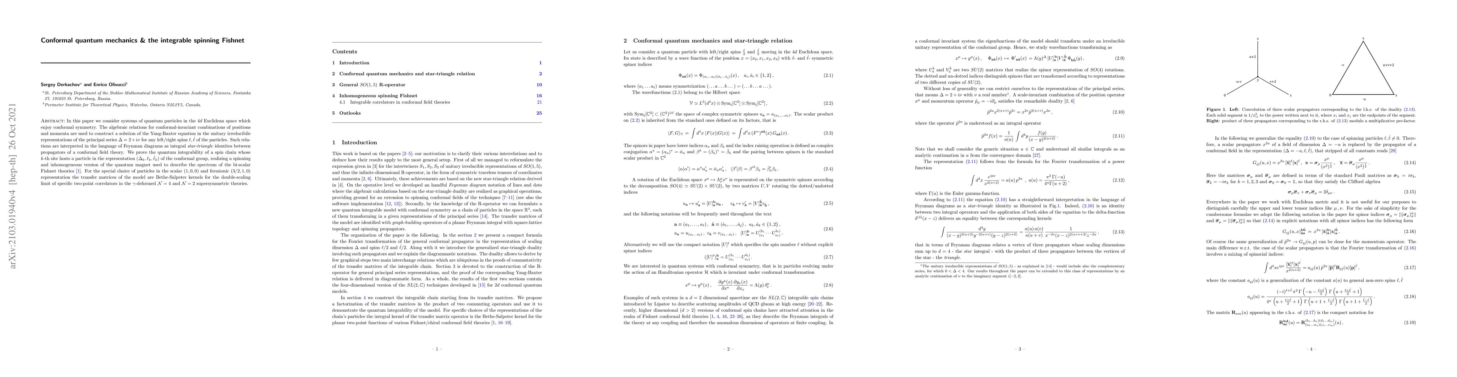 In this paper we consider systems of quantum particles in the $4d$ Euclidean space which enjoy conformal symmetry. The algebraic relations for conformal-invariant combinations of positions and momenta are used to construct a solution of the Yang-Baxter equation in the unitary irreducibile representations of the principal series $\Delta=2+i\nu$ for any left/right spins $\ell,\dot{\ell}$ of the particles. Such relations are interpreted in the language of Feynman diagrams as integral \emph{star-triangle} identites between propagators of a conformal field theory. We prove the quantum integrability of a spin chain whose $k$-th site hosts a particle in the representation $(\Delta_k,\ell_k, \dot{ \ell}_k)$ of the conformal group, realizing a spinning and inhomogeneous version of the quantum magnet used to describe the spectrum of the bi-scalar Fishnet theories. For the special choice of particles in the scalar $(1,0,0)$ and fermionic $(3/2,1,0)$ representation the transfer matrices of the model are Bethe-Salpeter kernels for the double-scaling limit of specific two-point correlators in the $\gamma$-deformed $\mathcal{N}=4$ and $\mathcal{N}=2$ supersymmetric theories.