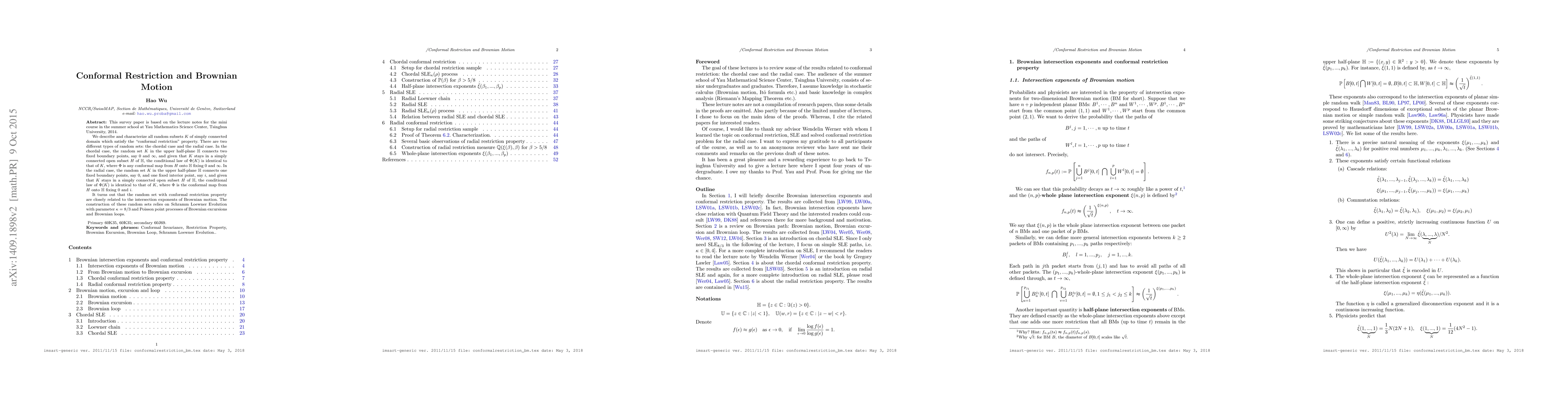 Two-line summary: This paper reviews the results of conformal restriction in both chordal and radial cases, focusing on Brownian intersection exponents and the conformal restriction property. It also examines Stochastic Loewner Evolution (SLE) and delves into the properties of these phenomena in the context of Brownian motion.