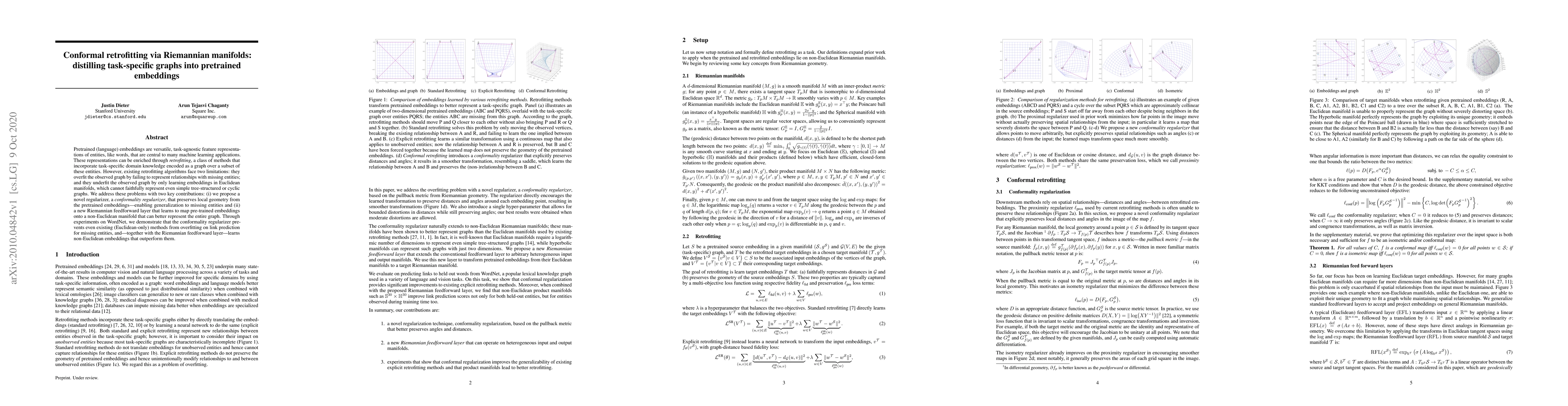 This paper proposes a conformality regularizer and a Riemannian feedforward layer to retrofit pretrained embeddings for task-specific graphs, addressing overfitting and underfitting issues. The conformality regularizer generalizes to missing entities, while the Riemannian layer represents complex graph structures better than Euclidean methods.