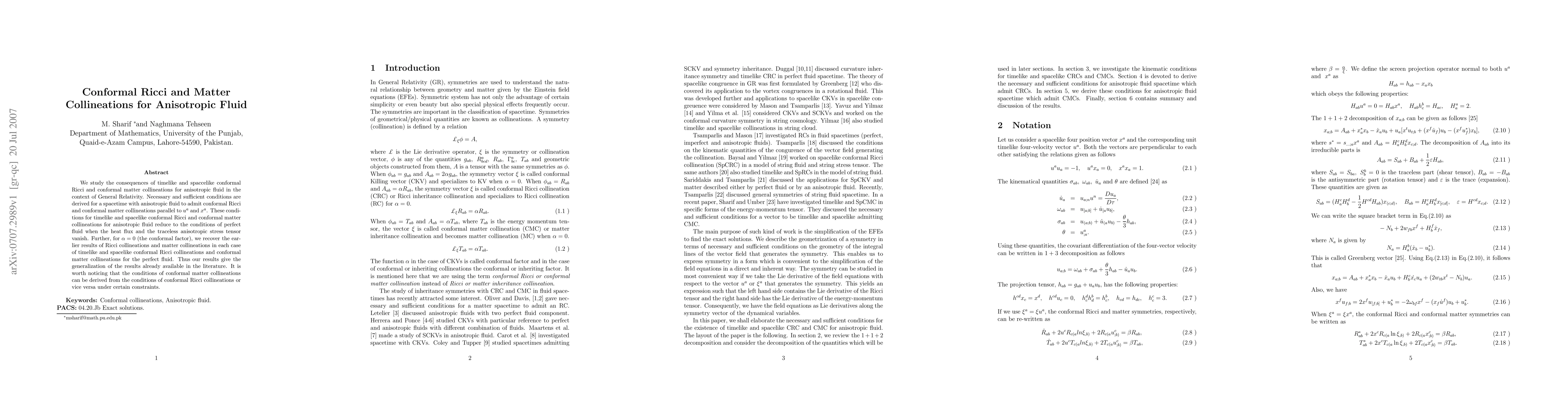 This paper investigates the implications of conformal Ricci and matter collineations for anisotropic fluid in General Relativity, deriving necessary and sufficient conditions for spacetimes with such fluids. The study generalizes existing results for perfect fluids by considering vanishing heat flux and anisotropic stress tensors.