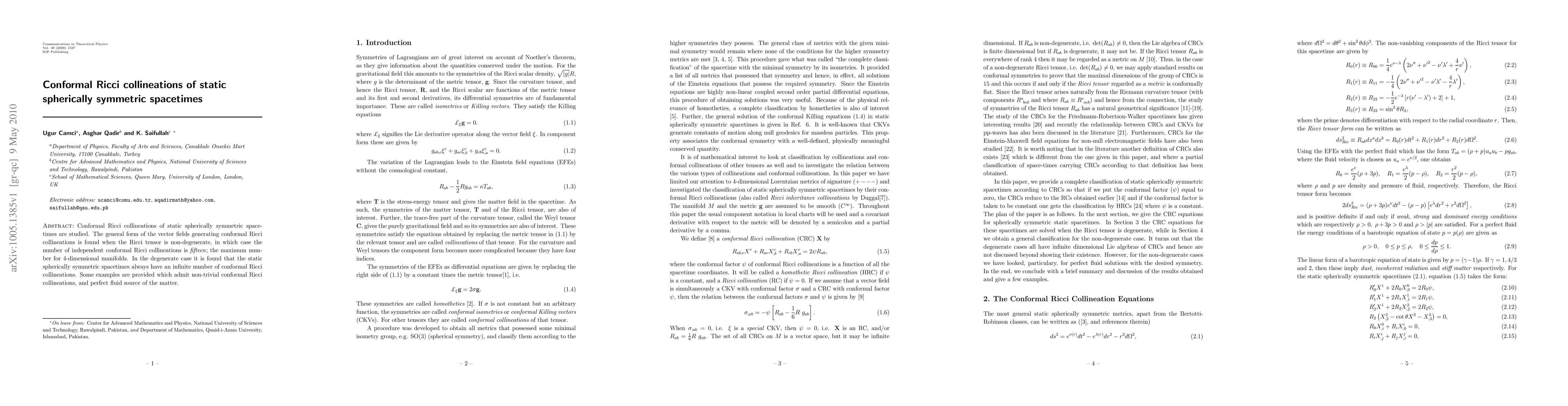 This paper investigates conformal Ricci collineations in static spherically symmetric spacetimes, finding that non-degenerate Ricci tensors allow for fifteen independent collineations, the maximum for 4-dimensional manifolds. In degenerate cases, these spacetimes exhibit an infinite number of conformal Ricci collineations. Examples with non-trivial collineations and perfect fluid matter sources are also provided.