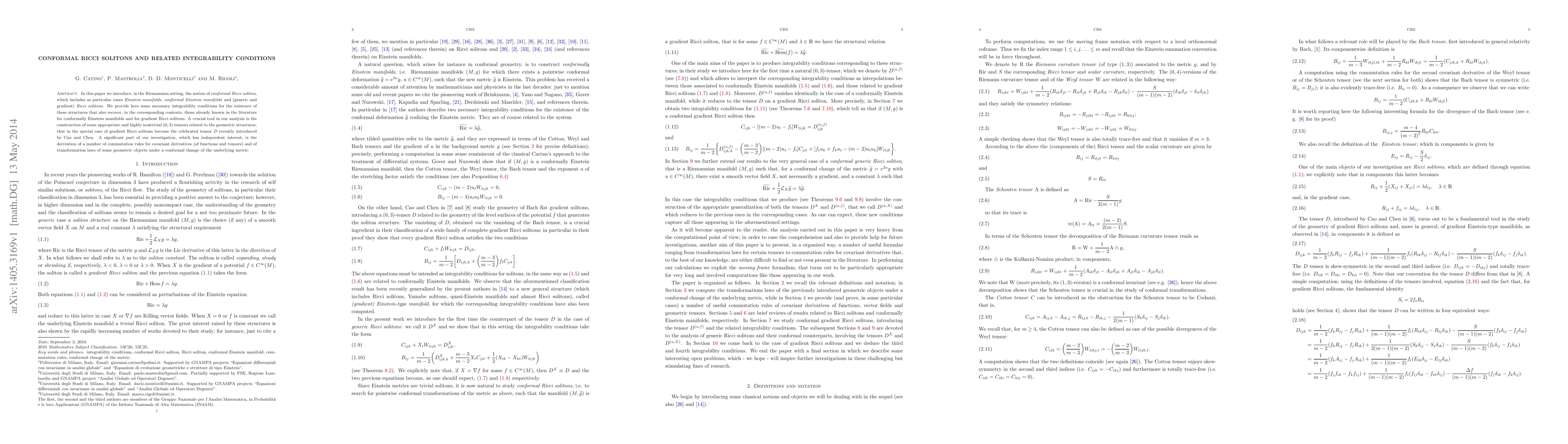 This paper introduces conformal Ricci solitons in Riemannian geometry, encompassing Einstein, conformal Einstein, and Ricci solitons. It presents necessary integrability conditions for their existence and derives commutation rules for covariant derivatives and transformation laws for geometric objects under metric conformal changes.