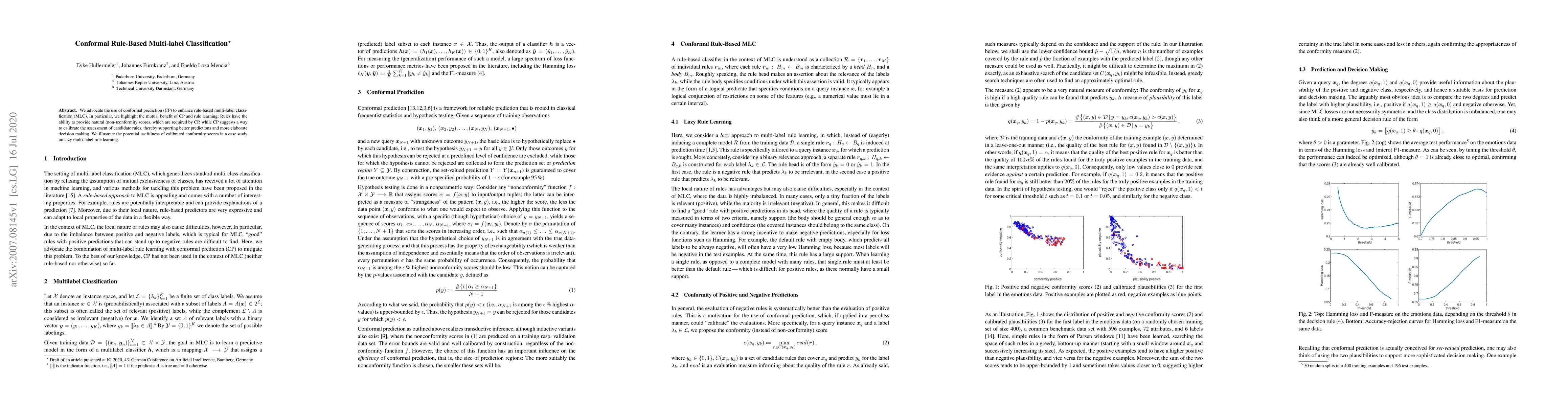 This paper proposes integrating conformal prediction with rule-based multi-label classification to enhance prediction accuracy. It demonstrates how rules provide conformity scores for conformal prediction, while conformal prediction calibrates rule assessments, leading to better decision-making, as shown in a case study on lazy multi-label rule learning.
