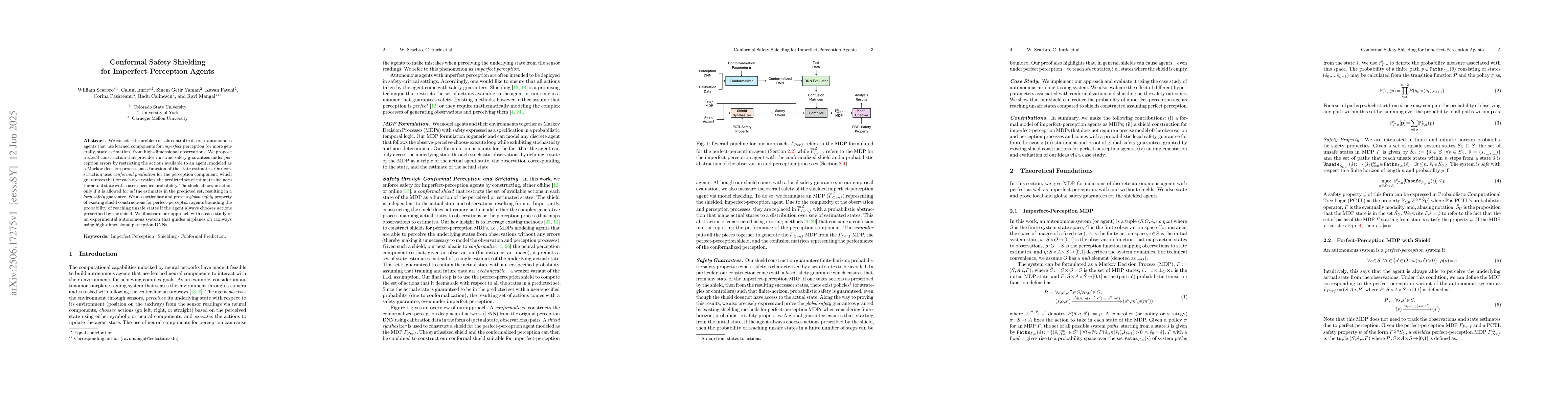 We consider the problem of safe control in discrete autonomous agents that use learned components for imperfect perception (or more generally, state estimation) from high-dimensional observations. We propose a shield construction that provides run-time safety guarantees under perception errors by restricting the actions available to an agent, modeled as a Markov decision process, as a function of the state estimates. Our construction uses conformal prediction for the perception component, which guarantees that for each observation, the predicted set of estimates includes the actual state with a user-specified probability. The shield allows an action only if it is allowed for all the estimates in the predicted set, resulting in a local safety guarantee. We also articulate and prove a global safety property of existing shield constructions for perfect-perception agents bounding the probability of reaching unsafe states if the agent always chooses actions prescribed by the shield. We illustrate our approach with a case-study of an experimental autonomous system that guides airplanes on taxiways using high-dimensional perception DNNs.