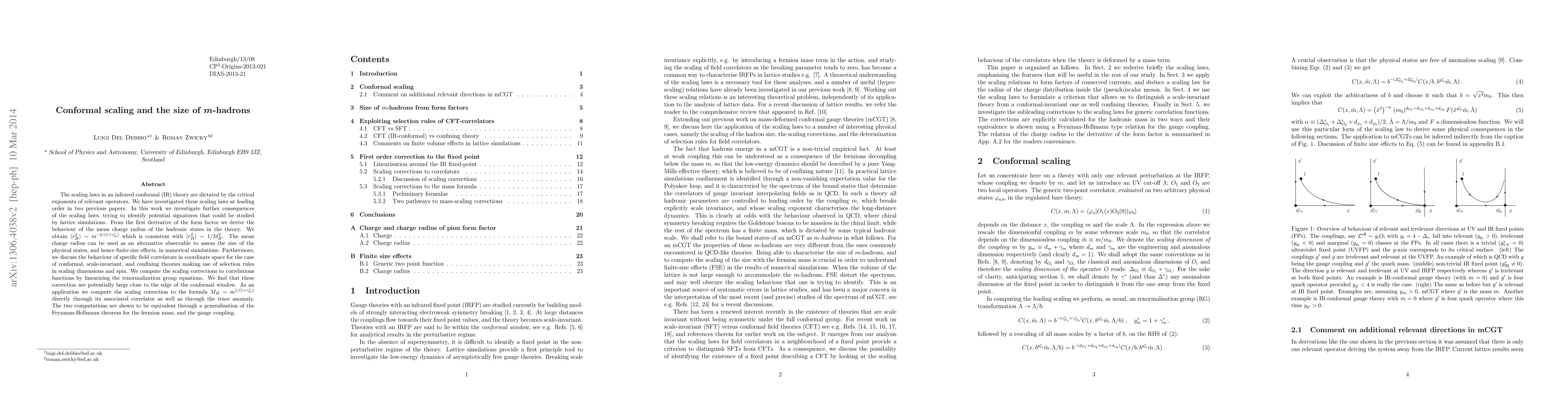 This paper explores the scaling laws in infrared conformal theories, deriving the mean charge radius of $m$-hadrons as $\langle r_H^2 \rangle \sim m^{-2/(1+\gamma^*_m)}$, which aligns with $\langle r_H^2 \rangle \sim 1/M_H^2$. It proposes the mean charge radius as an alternative observable for assessing the size of physical states in lattice simulations.