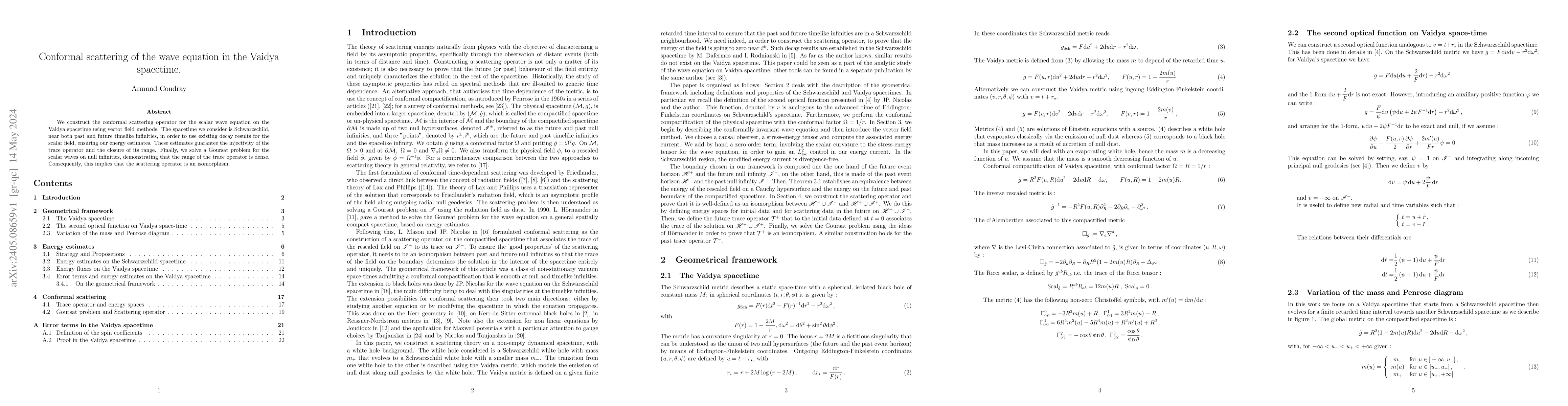 We construct the conformal scattering operator for the scalar wave equation on the Vaidya spacetime using vector field methods. The spacetime we consider is Schwarzschild, near both past and future timelike infinities, in order to use existing decay results for the scalar field, ensuring our energy estimates. These estimates guarantee the injectivity of the trace operator and the closure of its range. Finally, we solve a Goursat problem for the scalar waves on null infinities, demonstrating that the range of the trace operator is dense. Consequently, this implies that the scattering operator is an isomorphism.