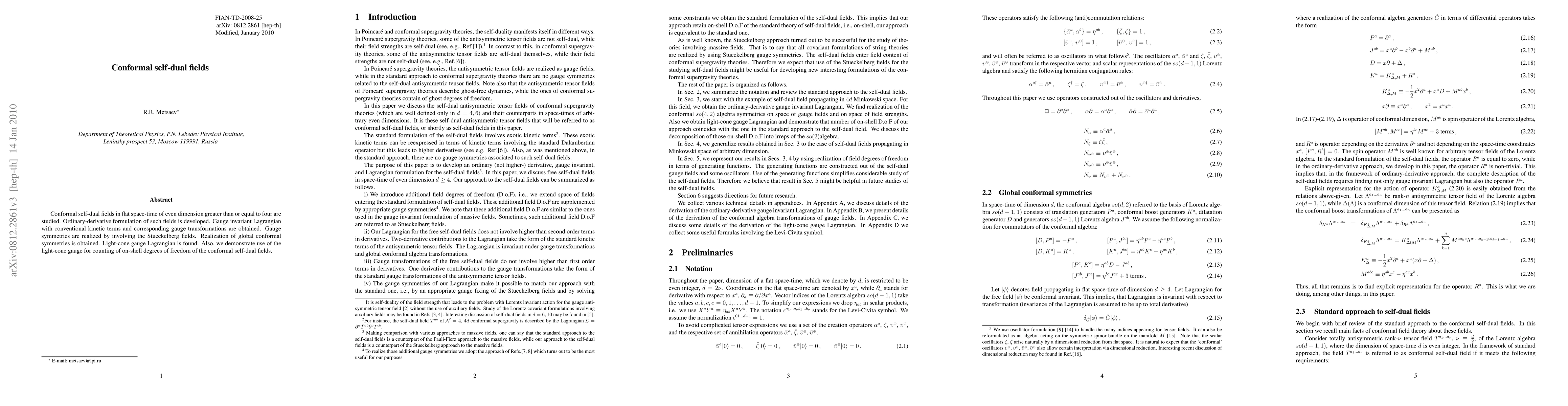This paper develops an ordinary-derivative formulation for conformal self-dual fields in even-dimensional flat space-time, deriving a gauge invariant Lagrangian and corresponding gauge transformations, and demonstrates the use of the light-cone gauge for counting on-shell degrees of freedom.