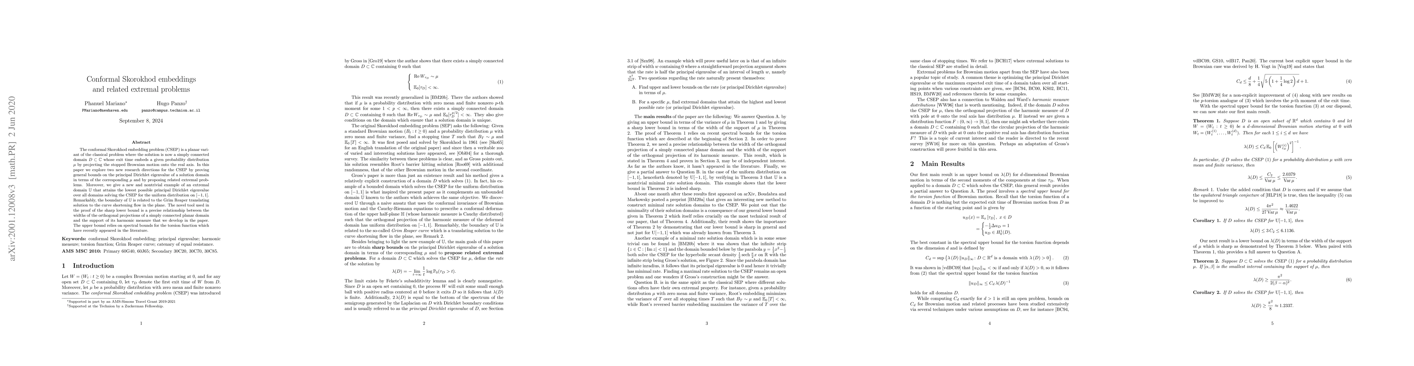 This paper explores the Conformal Skorokhod Embedding Problem (CSEP) in the complex plane, providing general bounds on the principal Dirichlet eigenvalue of a solution domain related to the input probability distribution. A novel example of an extremal domain is presented, achieving the lowest eigenvalue for the uniform distribution on [-1,1], with its boundary linked to the Grim Reaper solution in curve shortening flow. The research introduces a relationship between a domain's projection widths and its harmonic measure support, using it to prove sharp eigenvalue bounds.