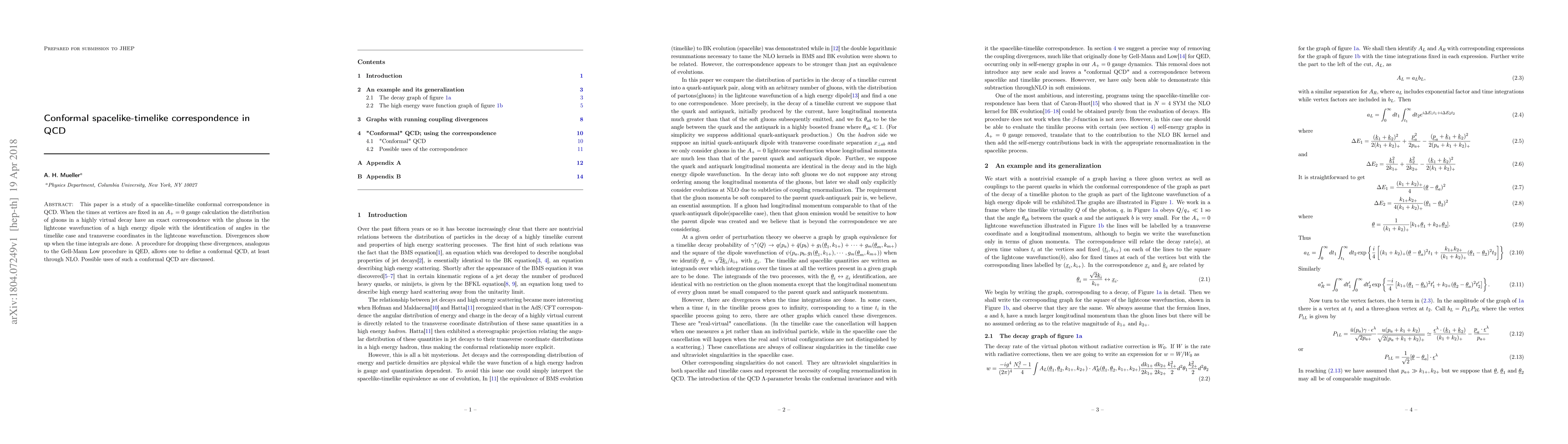 This paper is a study of a spacelike-timelike conformal correspondence in QCD. When the times at vertices are fixed in an A_+ = 0 gauge calculation the distribution of gluons in a highly virtual decay have an exact correspondence with the gluons in the lightcone wavefunction of a high energy dipole with the identification of angles in the timelike case and transverse coordinates in the lightcone wavefunction. Divergences show up when the time integrals are done. A procedure for dropping these divergences, analogous to the Gell-Mann Low procedure in QED, allows one to define a conformal QCD, at least through NLO. Possible uses of such a conformal QCD are discussed.