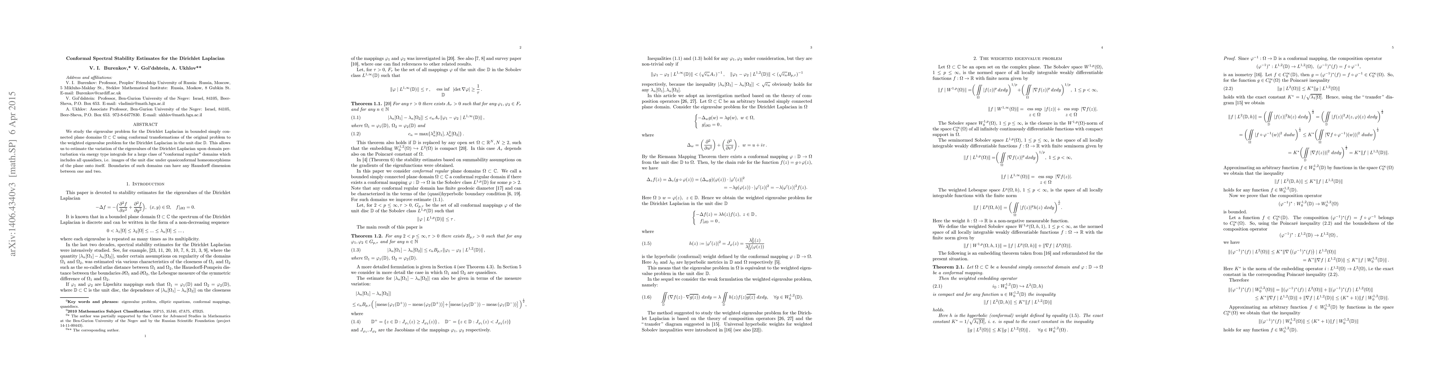 We study the eigenvalue problem for the Dirichlet Laplacian in bounded simply connected plane domains $\Omega\subset\mathbb{C}$ using conformal transformations of the original problem to the weighted eigenvalue problem for the Dirichlet Laplacian in the unit disc $\mathbb{D}$. This allows us to estimate the variation of the eigenvalues of the Dirichlet Laplacian upon domain perturbation via energy type integrals for a large class of "conformal regular" domains which includes all quasidiscs, i.e. images of the unit disc under quasiconformal homeomorphisms of the plane onto itself. Boundaries of such domains can have any Hausdorff dimension between one and two.