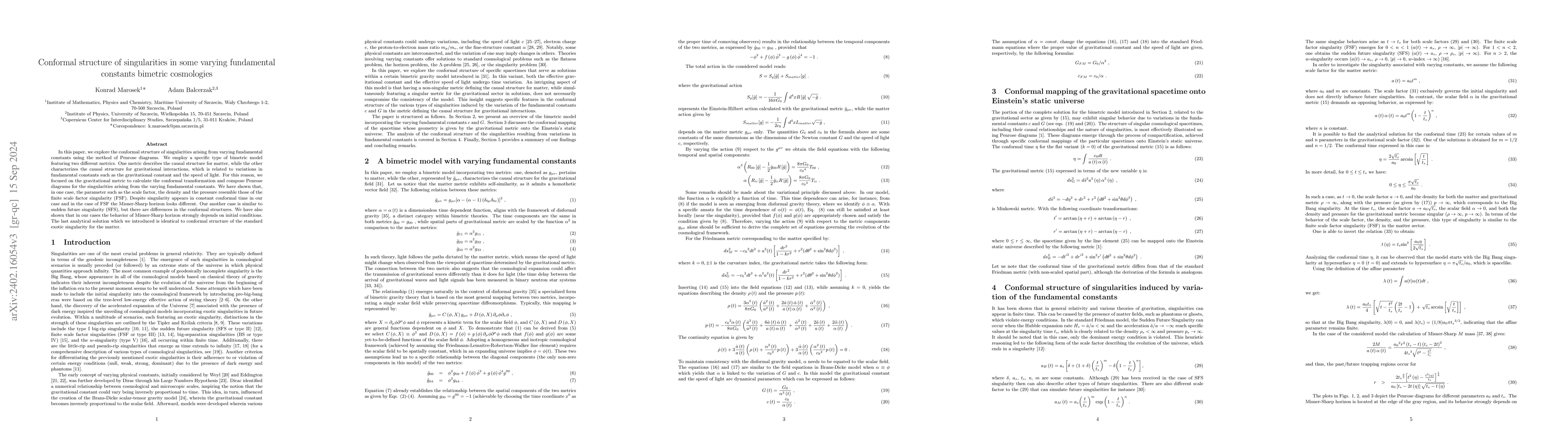 In this paper, we explore the conformal structure of singularities arising from varying fundamental constants using the method of Penrose diagrams. We employ a specific type of bimetric model featuring two different metrics. One metric describes the causal structure for matter, while the other characterizes the causal structure for gravitational interactions, which is related to variations in fundamental constants such as the gravitational constant and the speed of light. For this reason, we focused on the gravitational metric to calculate the conformal transformation and compose Penrose diagrams for the singularities arising from the varying fundamental constants. We have shown that, in one case, the parameter such as the scale factor, the density and the pressure resemble those of the finite scale factor singularity (FSF). Despite singularity appears in constant conformal time in our case and in the case of FSF the Misner-Sharp horizon looks different. Our another case is similar to sudden future singularity (SFS), but there are differences in the conformal structures. We have also shown that in our cases the behavior of Misner-Sharp horizon strongly depends on initial conditions. The last analytical solution which we introduced is identical to conformal structure of the standard exotic singularity for the matter.