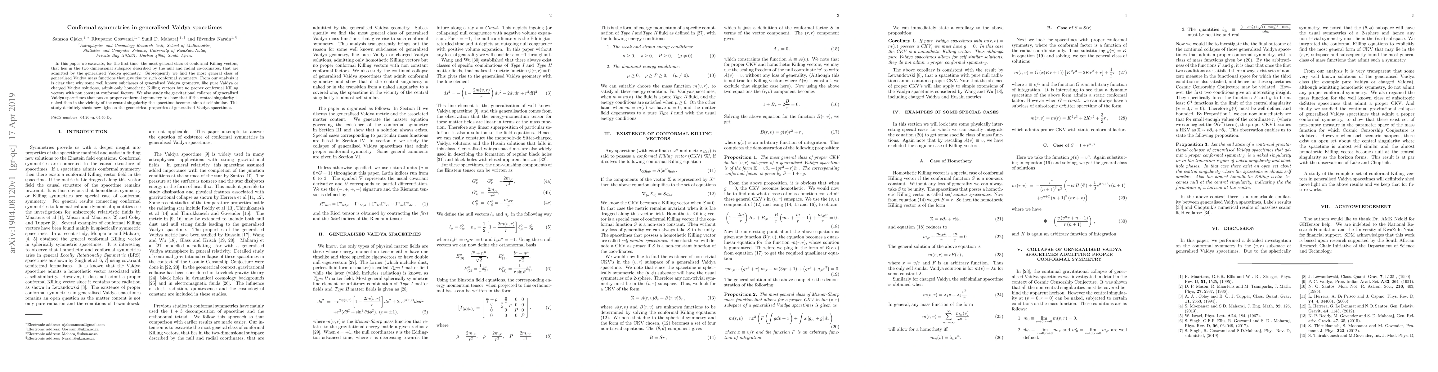 In this paper we excavate, for the first time, the most general class of conformal Killing vectors, that lies in the two dimensional subspace described by the null and radial co-ordinates, that are admitted by the generalised Vaidya geometry. Subsequently we find the most general class of generalised Vaidya mass functions that give rise to such conformal symmetry. From our analysis it is clear that why some well known subclasses of generalised Vaidya geometry, like pure Vaidya or charged Vaidya solutions, admit only homothetic Killing vectors but no proper conformal Killing vectors with non constant conformal factors. We also study the gravitational collapse of generalised Vaidya spacetimes that posses proper conformal symmetry to show that if the central singularity is naked then in the vicinity of the central singularity the spacetime becomes almost self similar. This study definitely sheds new light on the geometrical properties of generalised Vaidya spacetimes.