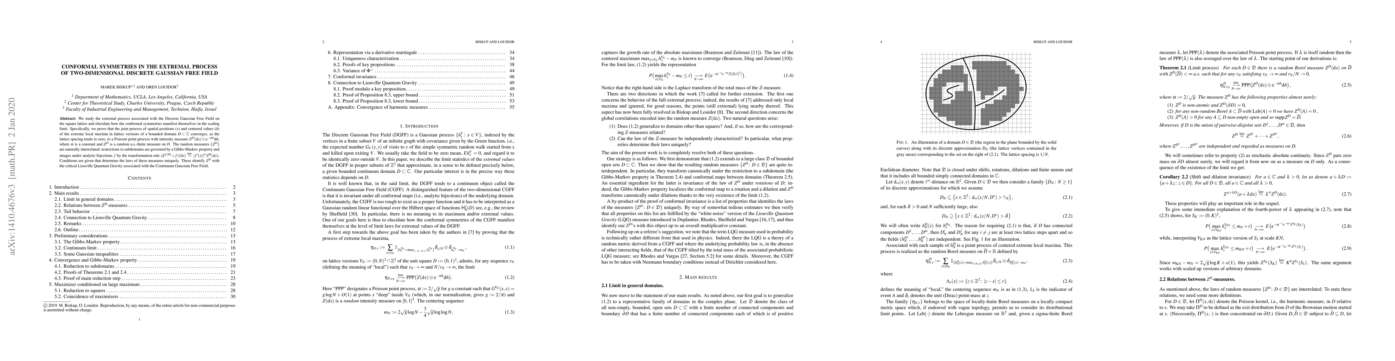 This paper investigates the conformal symmetries in the extremal process of the Discrete Gaussian Free Field on the square lattice, proving that the joint process of spatial positions and centered values of extreme local maxima converges to a Poisson point process, revealing connections to critical Liouville Quantum Gravity. The random measures involved exhibit Gibbs-Markov properties and transformation rules under analytic bijections.