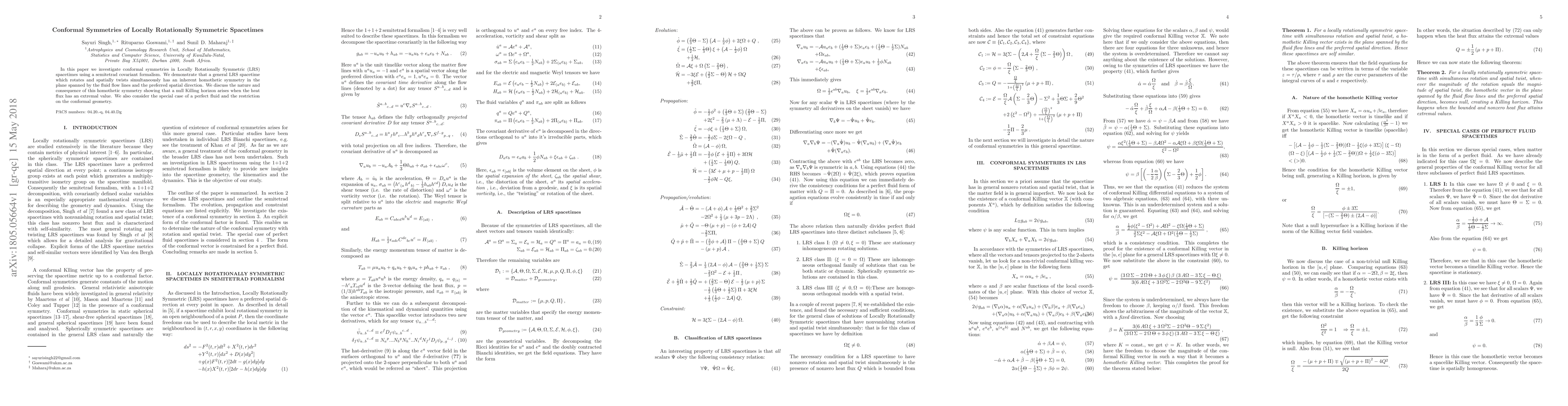 This paper explores conformal symmetries in Locally Rotationally Symmetric (LRS) spacetimes, revealing that such spacetimes inherently possess homothetic symmetry in the plane defined by fluid flow lines and a preferred spatial direction. The study also finds that a null Killing horizon emerges when the heat flux reaches an extremal value.