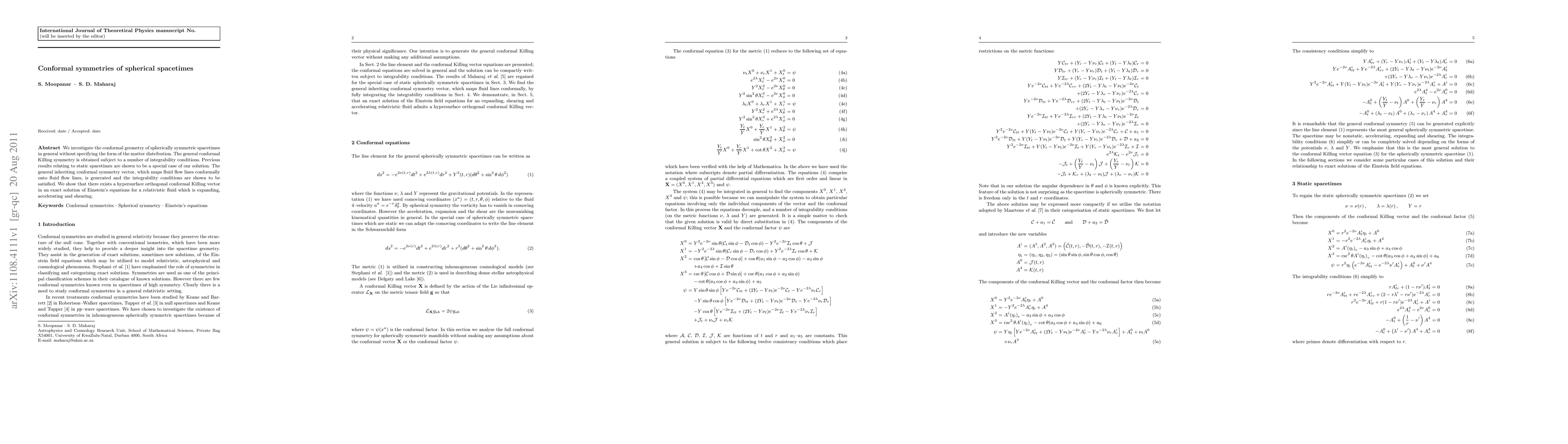 This paper explores the conformal geometry of spherically symmetric spacetimes, deriving general conformal Killing symmetries and showing that static spacetime results are a special case. It also identifies a hypersurface orthogonal conformal Killing vector in an exact solution for an expanding, accelerating, and shearing relativistic fluid.