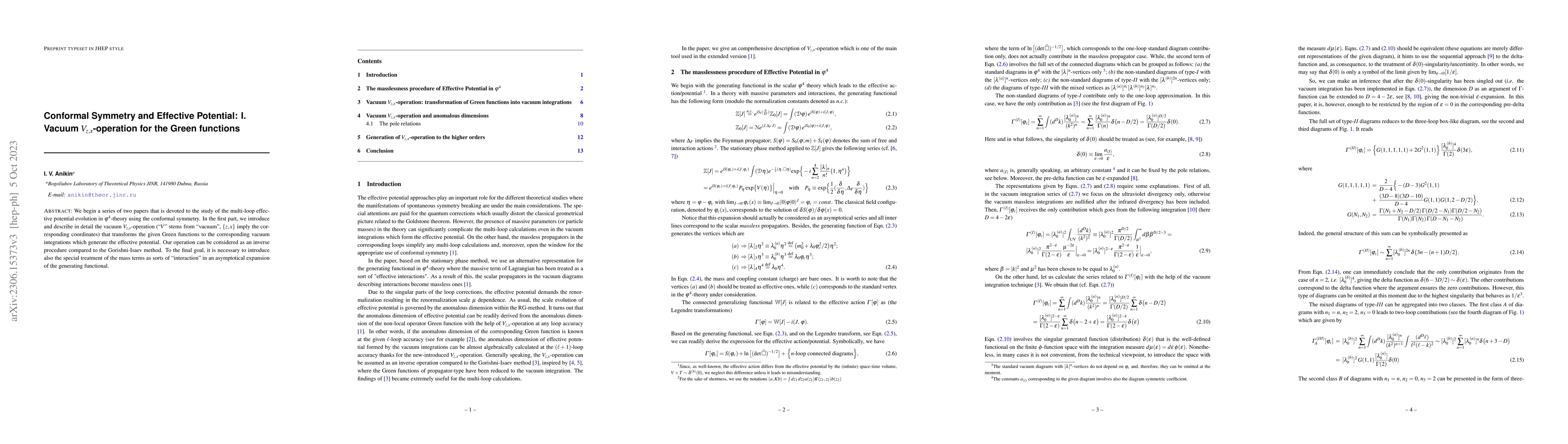 We begin a series of two papers that is devoted to the study of the multi-loop effective potential evolution in $\varphi^4$-theory using the conformal symmetry. In the first part, we introduce and describe in detail the vacuum $V_{z,x}$-operation ($"V"$ stems from "vacuum", $\{z,x\}$ imply the corresponding coordinates) that transforms the given Green functions to the corresponding vacuum integrations which generate the effective potential. Our operation can be considered as an inverse procedure compared to the Gorishni-Isaev method. To the final goal, it is necessary to introduce also the special treatment of the mass terms as sorts of "interaction" in an asymptotical expansion of the generating functional.