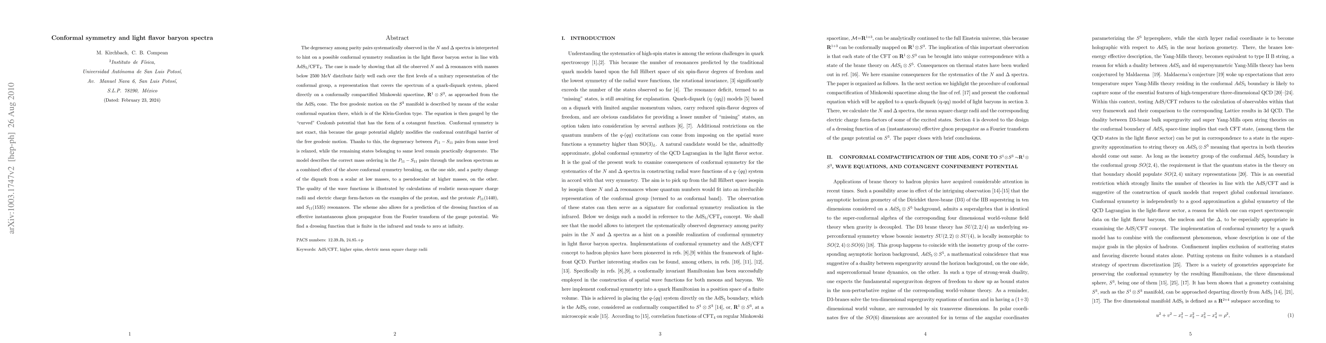 The degeneracy among parity pairs systematically observed in the N and Delta spectra is interpreted to hint on a possible conformal symmetry realization in the light flavor baryon sector in line with AdS_5/CFT_4. The case is made by showing that all the observed N and Delta resonances with masses below 2500 MeV distribute fairly well each over the first levels of a unitary representation of the conformal group, a representation that covers the spectrum of a quark-diquark system, placed directly on the AdS_5 cone, conformally compactified to R^1*S^3. The free geodesic motion on the S^3 manifold is described by means of the scalar conformal equation there, which is of the Klein-Gordon type. The equation is then gauged by the "curved" Coulomb potential that has the form of a cotangent function. Conformal symmetry is not exact, this because the gauge potential slightly modifies the conformal centrifugal barrier of the free geodesic motion. Thanks to this, the degeneracy between P11-S11 pairs from same level is relaxed, while the remaining states belonging to same level remain practically degenerate. The model describes the correct mass ordering in the P11-S11 pairs through the nucleon spectrum as a combined effect of the above conformal symmetry breaking, on the one side, and a parity change of the diquark from a scalar at low masses, to a pseudoscalar at higher masses, on the other. The quality of the wave functions is illustrated by calculations of realistic mean-square charge radii and electric charge form-factors on the examples of the proton, and the protonic P11(1440), and S11(1535) resonances. The scheme also allows for a prediction of the dressing function of an effective instantaneous gluon propagator from the Fourier transform of the gauge potential. We find a dressing function that is finite in the infrared and tends to zero at infinity.