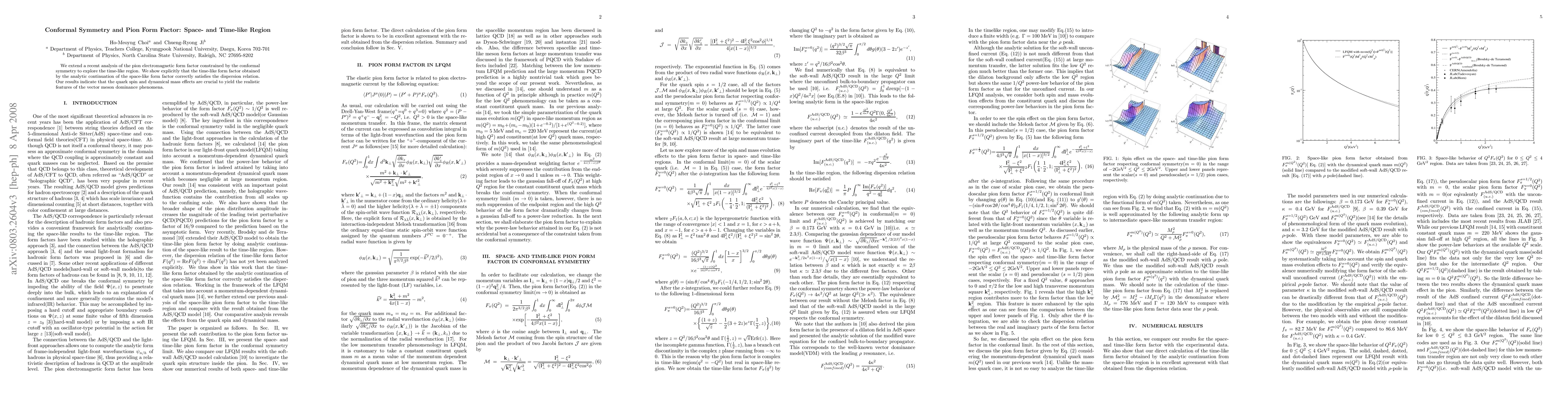 This paper extends the analysis of the pion electromagnetic form factor using conformal symmetry to the time-like region, demonstrating that the analytic continuation from the space-like region satisfies the dispersion relation. The study highlights the importance of quark spin and dynamical mass effects in capturing the vector meson dominance phenomena.