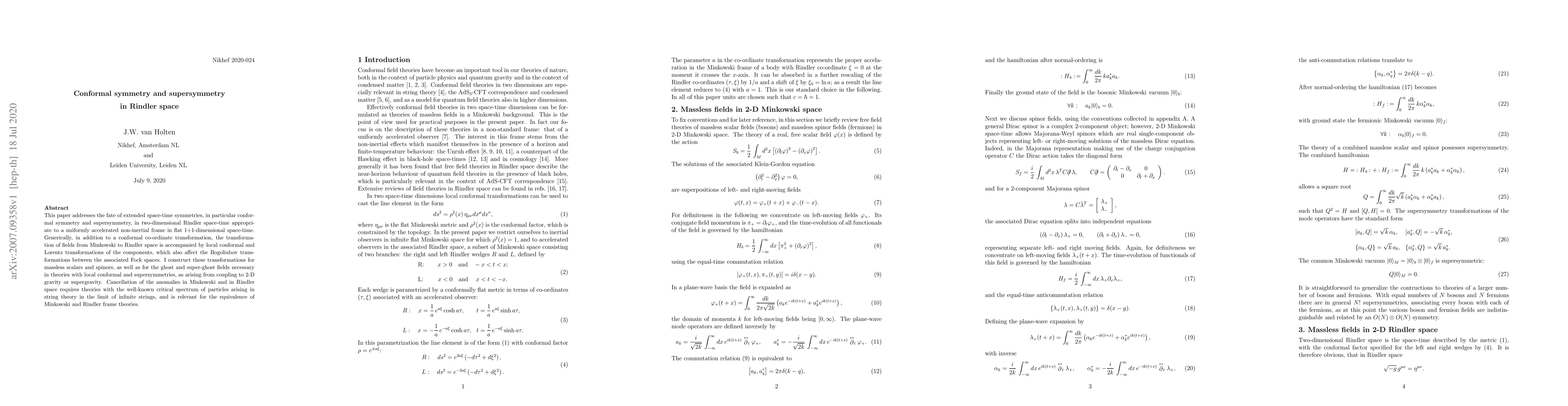 This paper addresses the fate of extended space-time symmetries, in particular conformal symmetry and supersymmetry, in two-dimensional Rindler space-time appropriate to a uniformly accelerated non-inertial frame in flat 1+1-dimensional space-time. Generically, in addition to a conformal co-ordinate transformation, the transformation of fields from Minkowski to Rindler space is accompanied by local conformal and Lorentz transformations of the components, which also affect the Bogoliubov transformations between the associated Fock spaces. I construct these transformations for massless scalars and spinors, as well as for the ghost and super-ghost fields necessary in theories with local conformal and supersymmetries, as arising from coupling to 2-D gravity or supergravity. Cancellation of the anomalies in Minkowski and in Rindler space requires theories with the well-known critical spectrum of particles arising in string theory in the limit of infinite strings, and is relevant for the equivalence of Minkowski and Rindler frame theories.