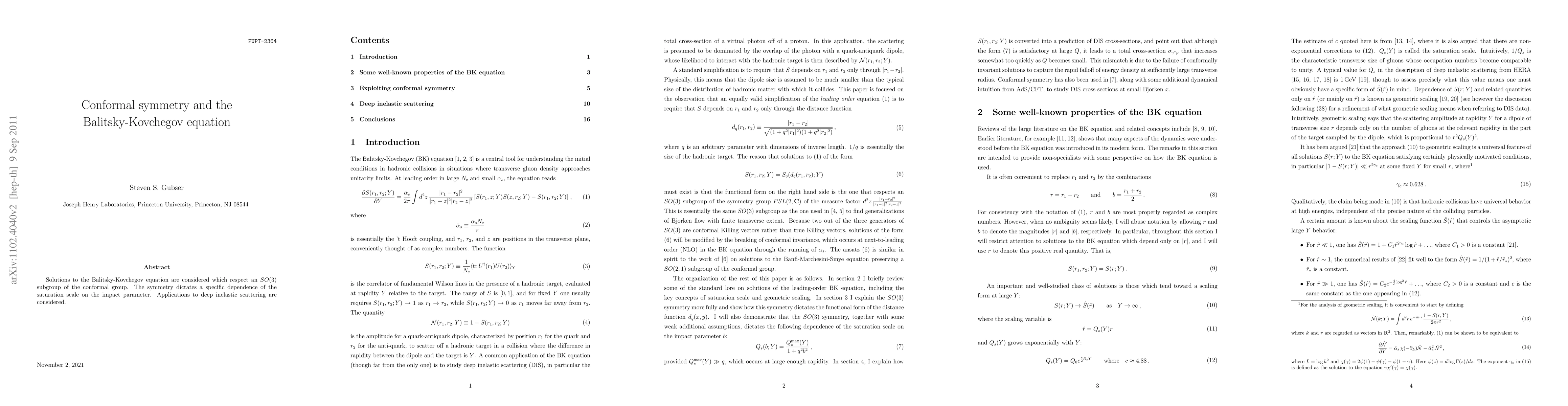 This paper explores solutions to the Balitsky-Kovchegov equation that adhere to an SO(3) subgroup of the conformal group, revealing a specific relationship between the saturation scale and the impact parameter. It also discusses implications for deep inelastic scattering processes.