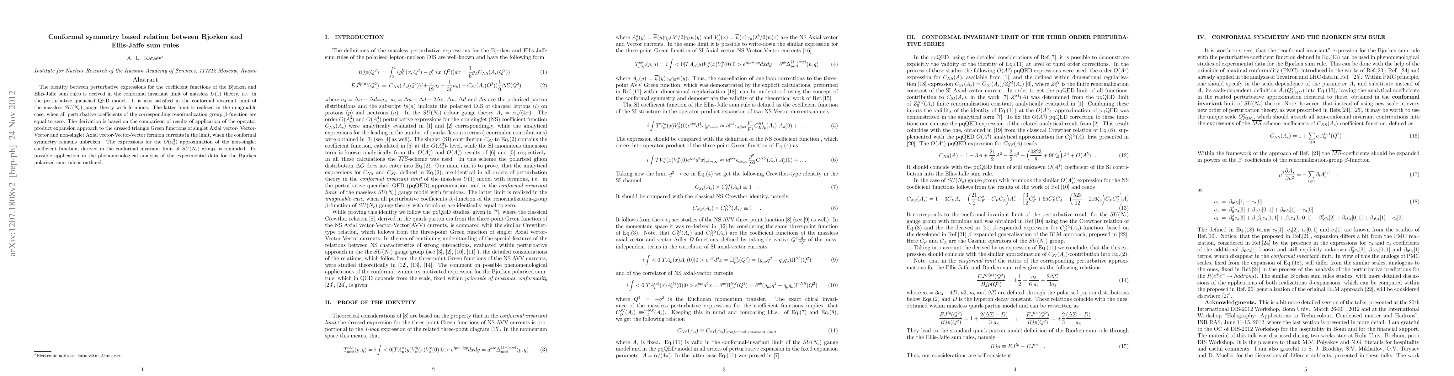 This paper derives the identity between Bjorken and Ellis-Jaffe sum rules in the conformal invariant limit of massless U(1) and $SU(N_c)$ gauge theories, using the operator product expansion approach. It highlights the potential application of these findings in analyzing experimental data for the Bjorken polarized sum rule.