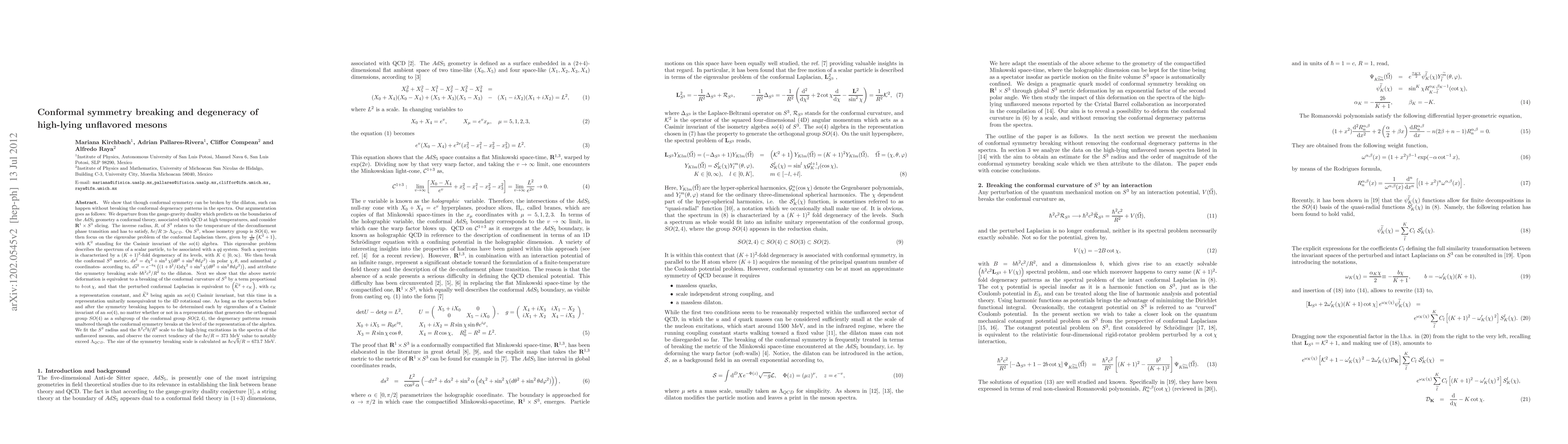 We show that though conformal symmetry can be broken by the dilaton, such can happen without breaking the conformal degeneracy patterns in the spectra. We departure from R^1XS^3 slicing of AdS_5 noticing that the inverse radius, R, of S^3 relates to the temperature of the deconfinement phase transition and has to satisfy, \hbar c/R >> \Lambda_{QCD}. We then focus on the eigenvalue problem of the S^3 conformal Laplacian, given by 1/R^2 (K^2+1), with K^2 standing for the Casimir invariant of the so(4) algebra. Such a spectrum is characterized by a (K+1)^2 fold degeneracy of its levels, with K\in [0,\infty). We then break the conformal S^3 metric as, d\tilde{s}^2=e^{-b\chi} ((1+b^2/4) d\chi^2 +\sin^2\chi (d\theta ^2 +\sin^2\theta d\varphi ^2)), and attribute the symmetry breaking scale, b\hbar^2c^2/R^2, to the dilaton. We show that such a metric deformation is equivalent to a breaking of the conformal curvature of S^3 by a term proportional to b\cot \chi, and that the perturbed conformal Laplacian is equivalent to (\tilde{K}^2 +c_K), with c_K a representation constant, and \tilde{K}^2 being again an so(4) Casimir invariant, but this time in a representation unitarily inequivalent to the 4D rotational. In effect, the spectra before and after the symmetry breaking are determined each by eigenvalues of a Casimir invariant of an so(4) algebra, a reason for which the degeneracies remain unaltered though the conformal group symmetry breaks at the level of the representation of its algebra. We fit the S^3 radius and the \hbar^2c^2b/R^2 scale to the high-lying excitations in the spectra of the unflavored mesons, and observe the correct tendency of the \hbar c /R=373 MeV value to notably exceed \Lambda_{QCD}. The size of the symmetry breaking scale is calculated as \hbar c \sqrt{b}/R=673.7 MeV.
